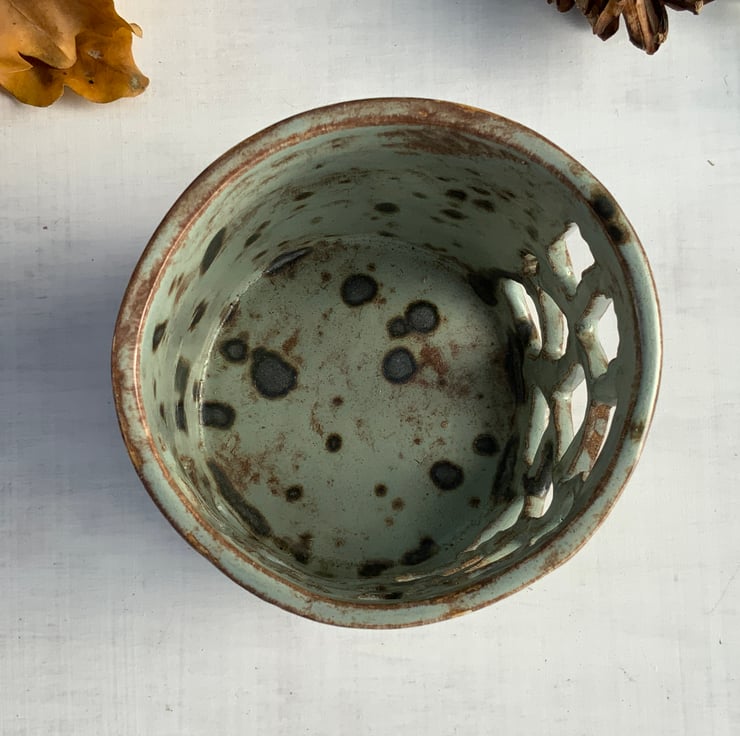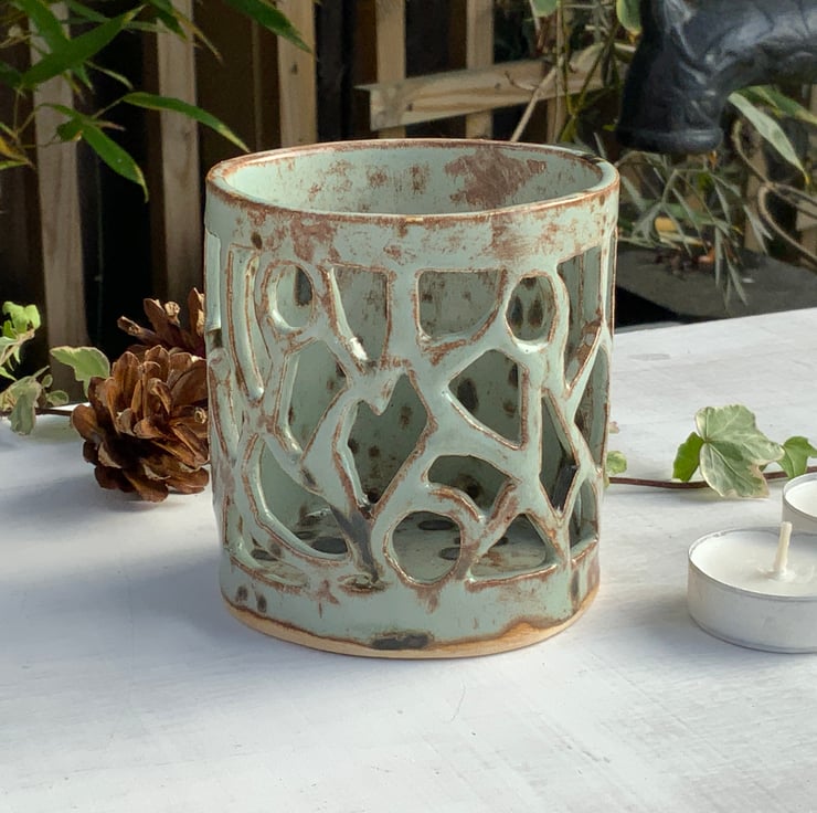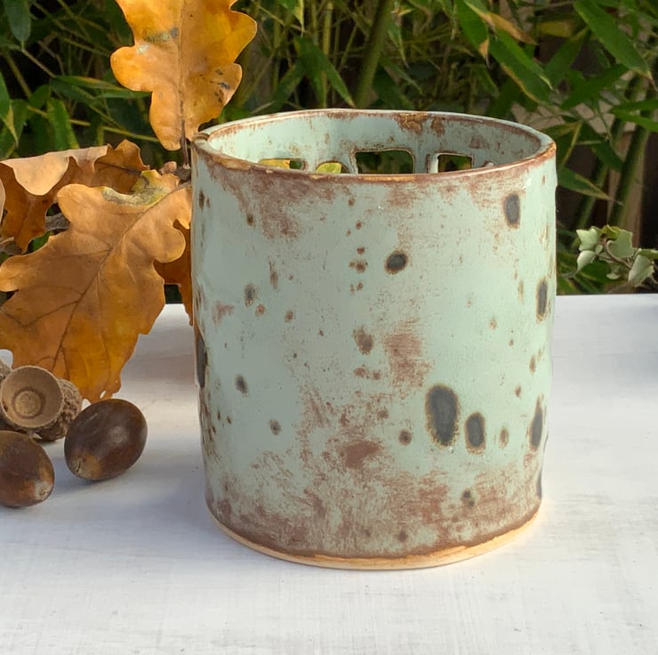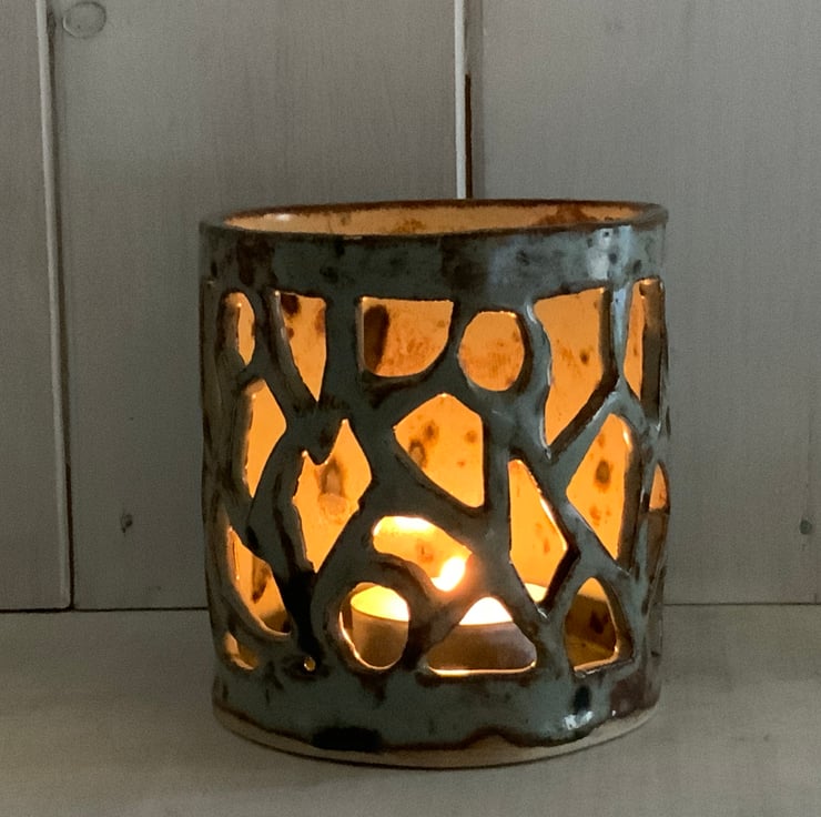 This rustic tealight holder is hand-built using earthenware clay. The candlelight is shown beautifully by the freeform lattice work to the front, while the soft speckled stone-brown glaze adds a weathered, earthy touch. Perfect for cosy evenings at home.