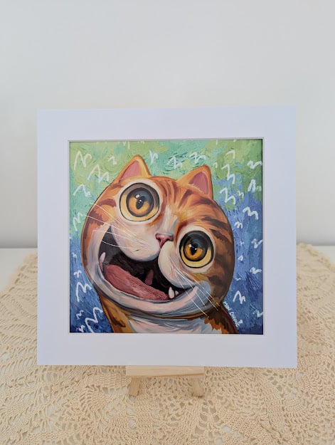 Capture pure, unbridled excitement with this energetic art print! This whimsical portrait features a bright orange tabby cat mid-grin, its mouth wide open and eyes glowing with playful intensity. The lively background of aqua and deep blue brushstrokes perfectly frames this bundle of joy. It's the ultimate mood booster and a guaranteed conversation starter for any cat lover's home!