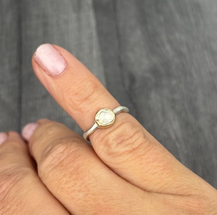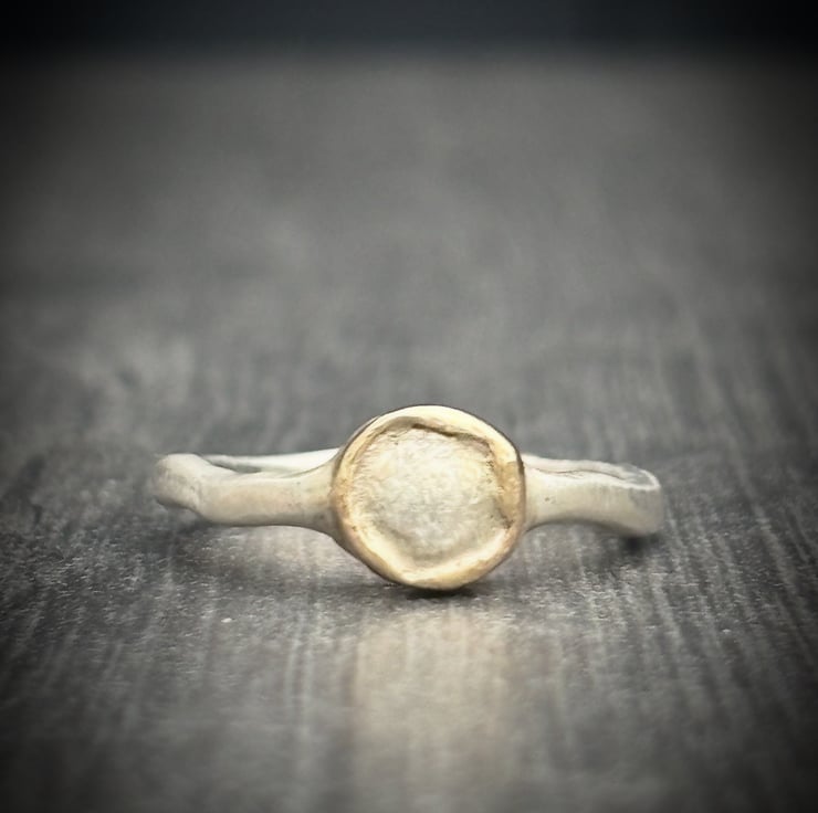 This Silver Pebble ring has been handcrafted using Sterling Silver and features a shiny 9ct yellow gold bezel around the pebble. The ring shank is slightly wavy and has a satin finish like the pebble. Michelle can make this ring in any size so please leave a message at Checkout.