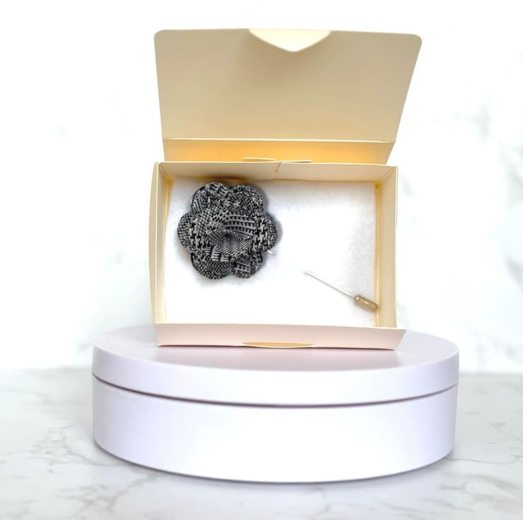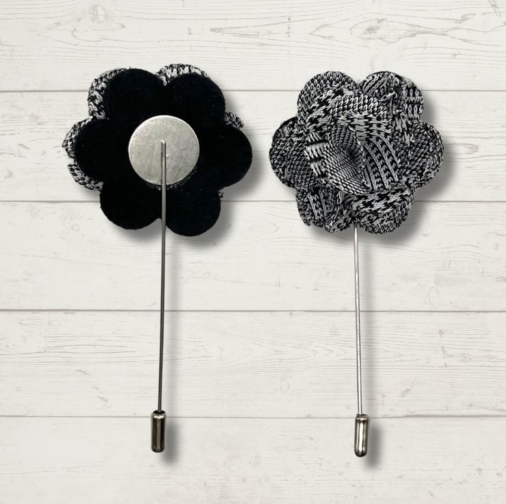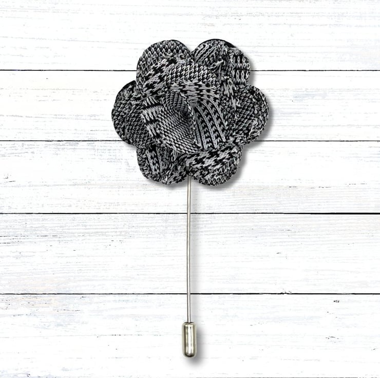 Add a subtle yet stylish finishing touch to your outfit with this handcrafted fabric flower lapel pin. Carefully sewn by hand using black and white dogtooth print fabric, this elegant accessory is the perfect finishing touch for weddings, parties or simply elevating your everyday suit.