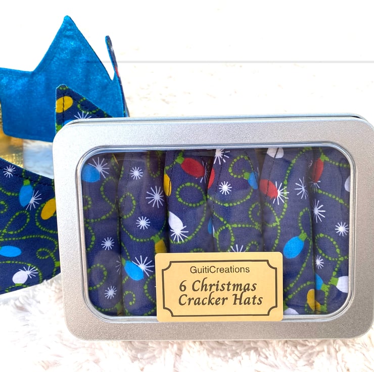 Eco-friendly reversible fabric Christmas cracker hats handmade in a festive pattern of Christmas lights and a reverse of glitter blue fabric that can be used year after year. Banish the aweful,one use, cheaply made and stain-inducing-when-wet paper crowns! These beautifully hand-made crowns will last for years if looked after.
