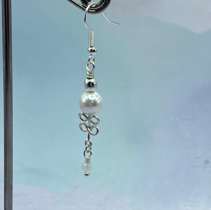 These unique and dainty earrings feature a pair of 8mm natural white shell pearls, sitting on top of handcrafted wirework loops made from silver plated copper wire. A tiny green angelite stone hangs from the bottom of each loop, adding a subtle sparkle as a finishing touch.