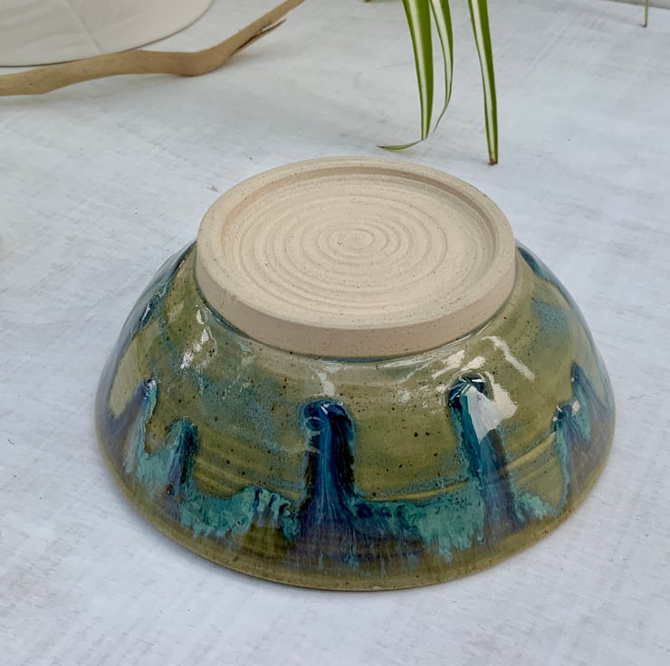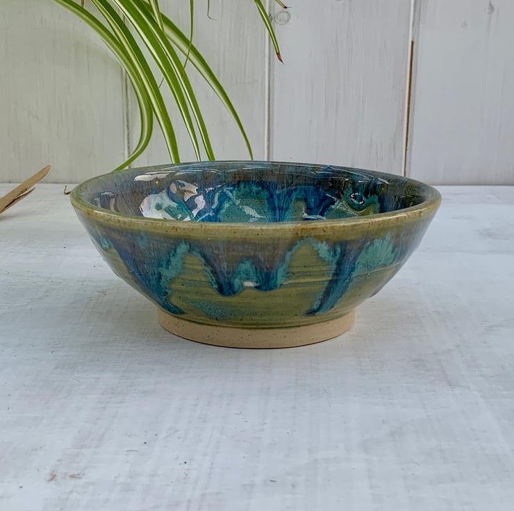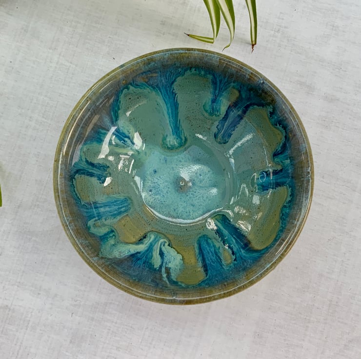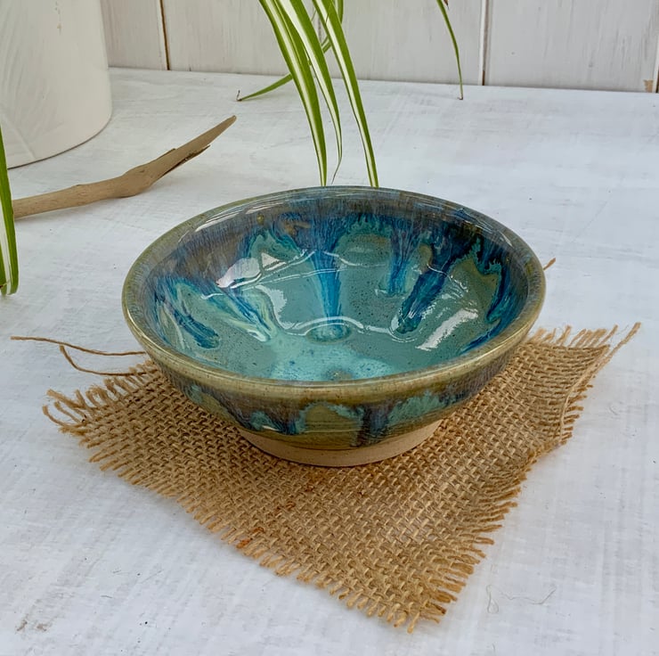 This beautiful little bowl is perfect for rings, trinkets or as a display piece. It has been wheel-thrown using stoneware clay and hand glazed with a combination of Oatmeal, Blue Rutile and Turquoise glazes. The flow of the glazes and the hand turned foot make this an elegant item to enhance your home.