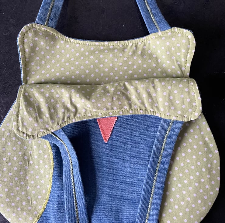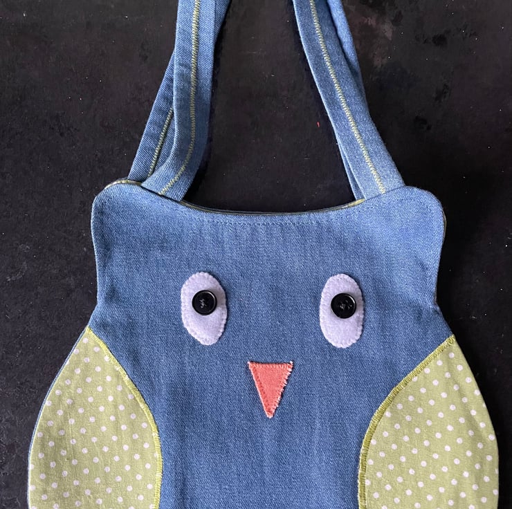 This bag is made from denim shaped like an owl and lined with green and white polka dot fabric. The front of the bag is decorated with fabrics to create the details of the owl.