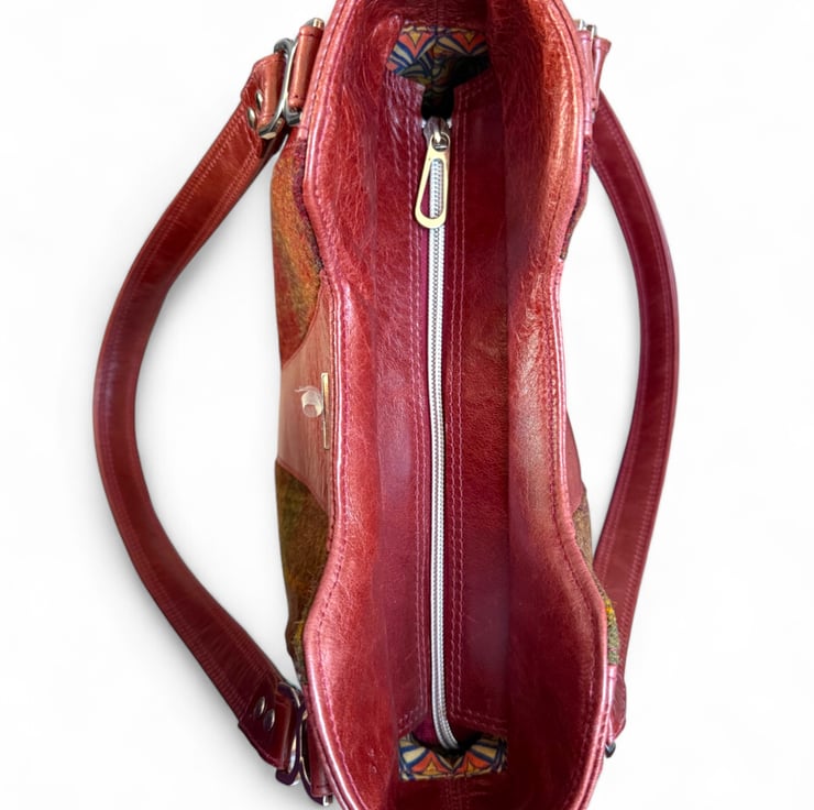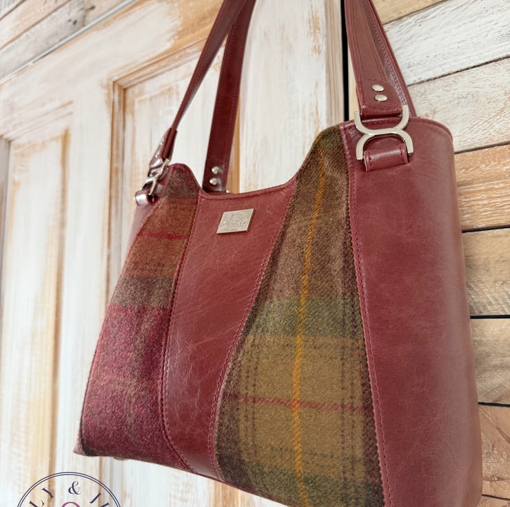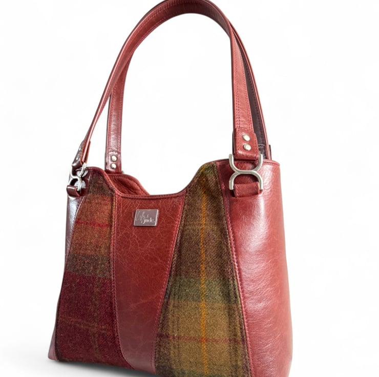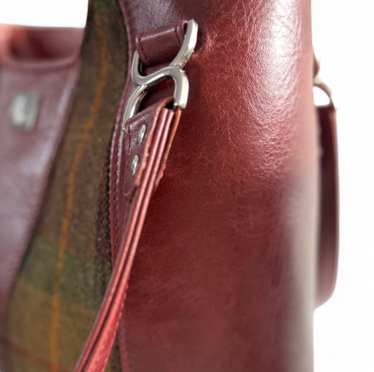- Handcrafted in the UK from rescued burgundy leather & woollen tweed
