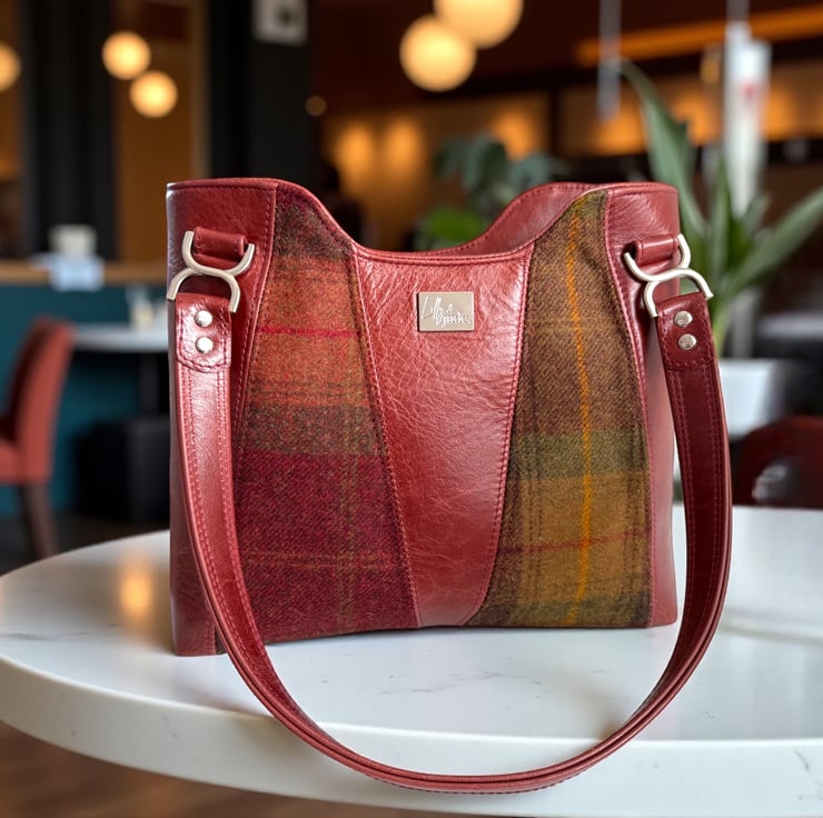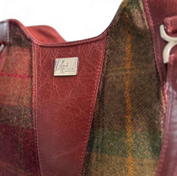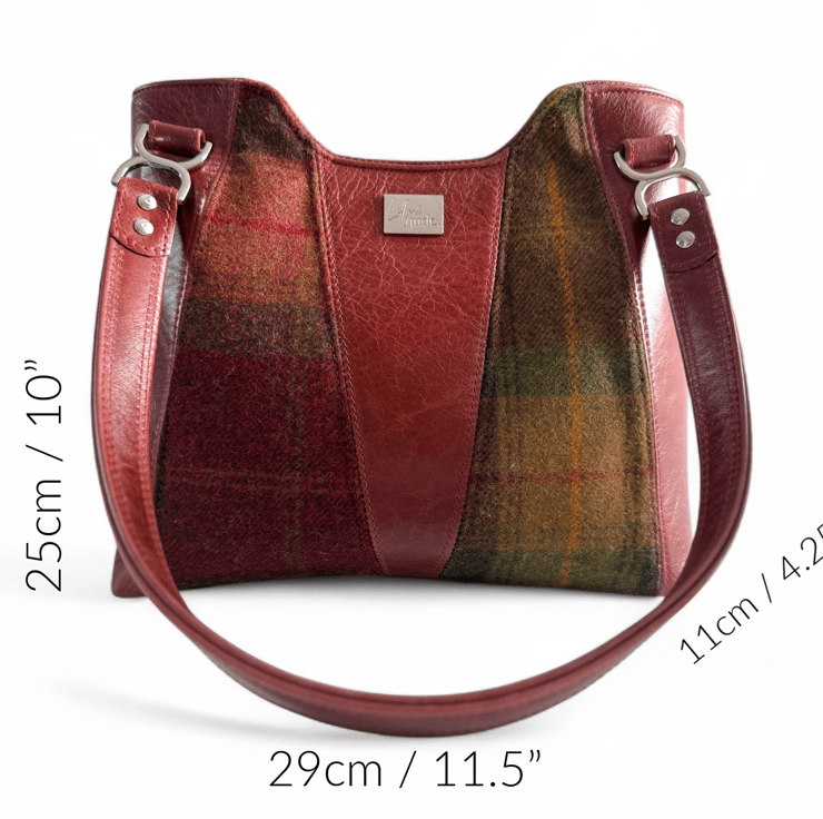 The Alaula is a beautifully structured mid-sized handbag that blends classic elegance with everyday practicality. Crafted from rich burgundy rescued leather and autumnal plaid woollen tweed, she’s the kind of bag that looks effortlessly put together - whether you’re heading to work, brunch, or a weekend shopping trip.