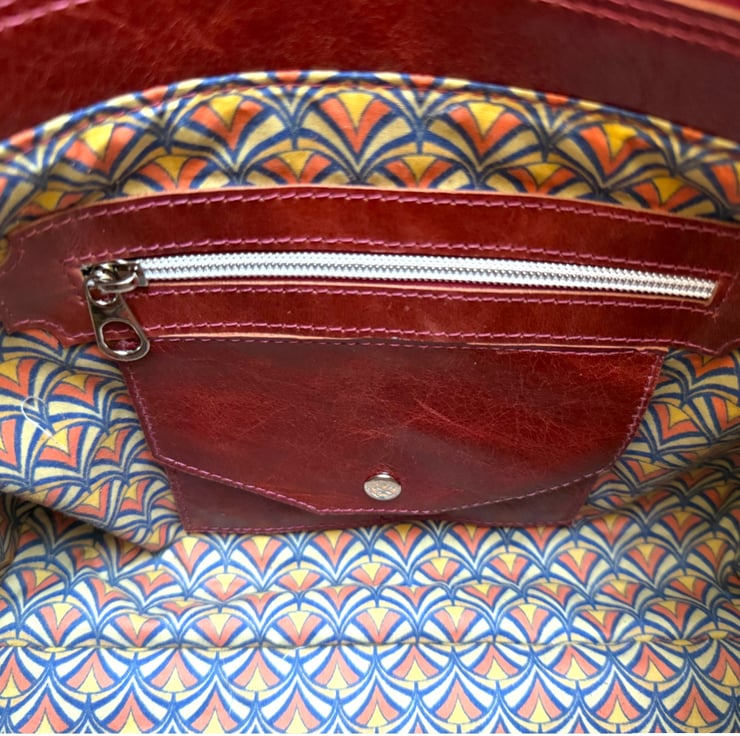 Her structured silhouette and fixed leather handles add a polished touch, while the Art Deco fan-patterned lining in burgundy, beige and navy brings a little joy every time you peek inside. She’s got proper organisation too: slip and zip pockets, plus the signature integrated leather purse for cards, cash, and change.