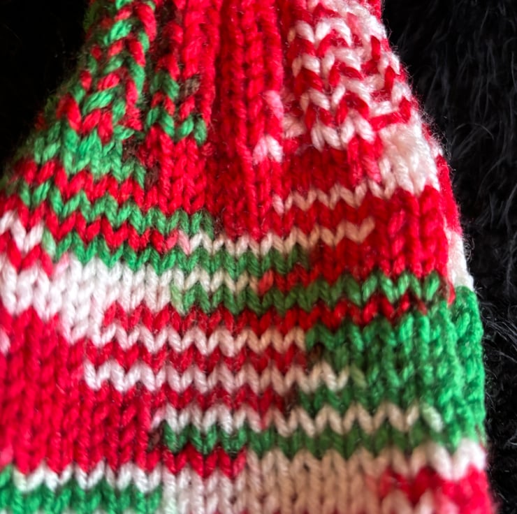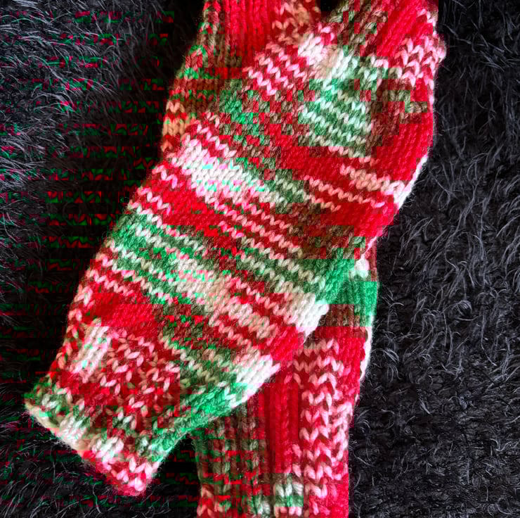 A pair of fun and festive hand knitted fingerless wrist warmers. These are knitted in acrylic yarn and have a candy cane appearance of festive green red and white. These will fit an average sized ladies hands.