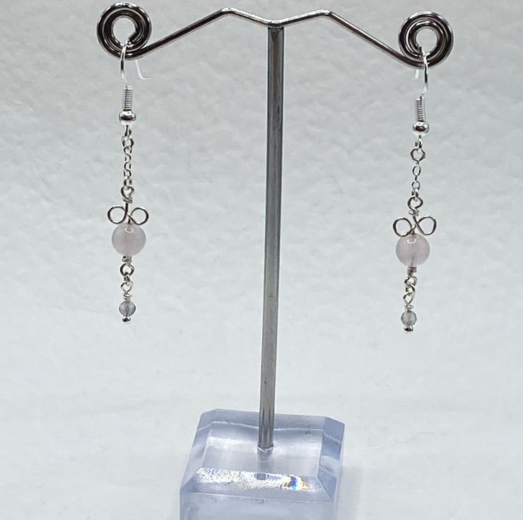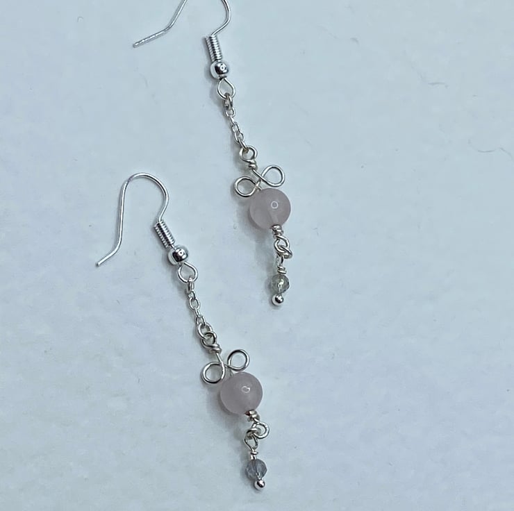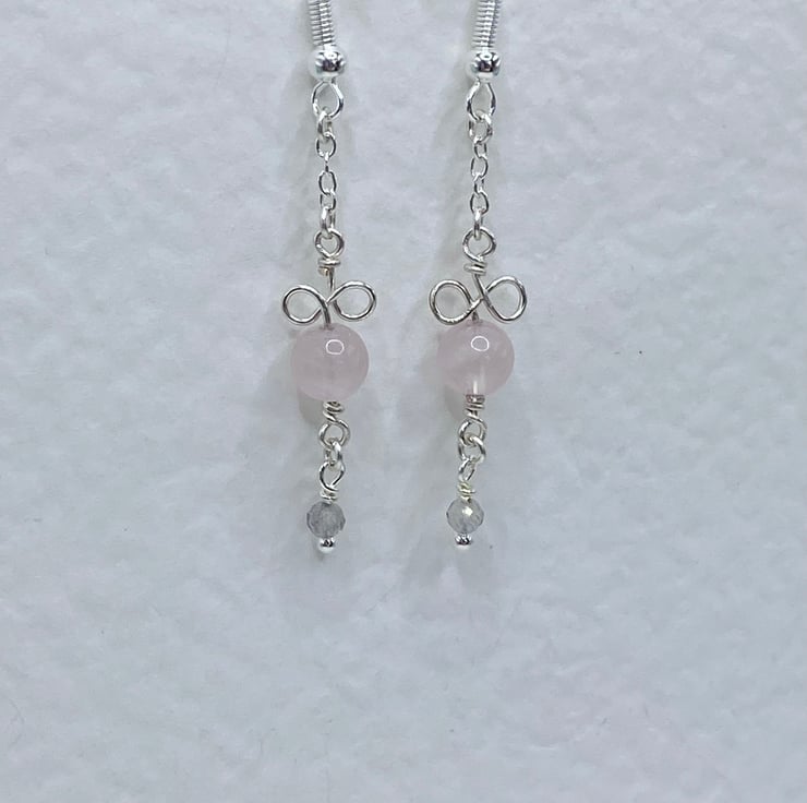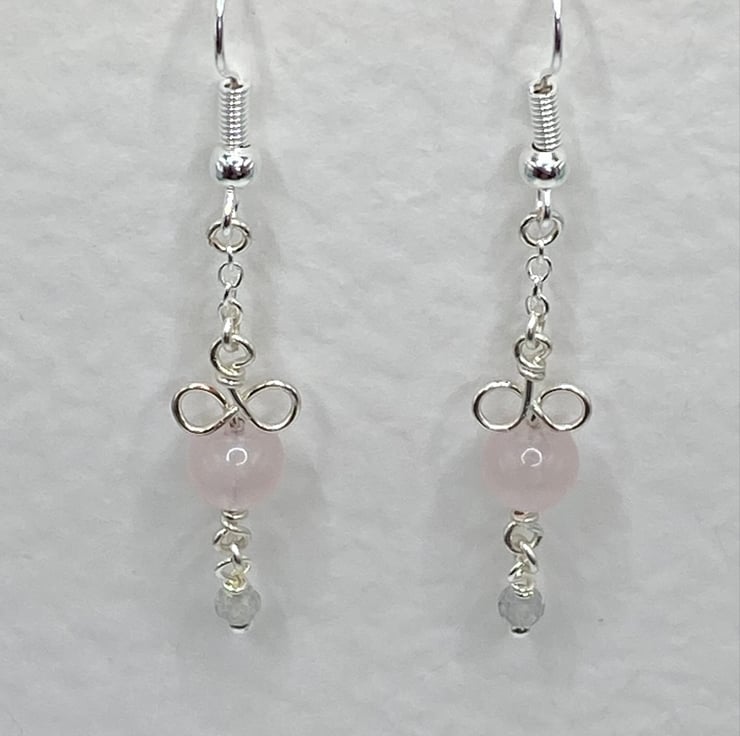 These unique and dainty earrings feature a pair of 8mm rose quartz stones, sitting beneath handcrafted wirework bows made from silver plated copper wire. A tiny faceted labradorite stone hangs from the bottom of each earring, adding a subtle sparkle as a finishing touch.
