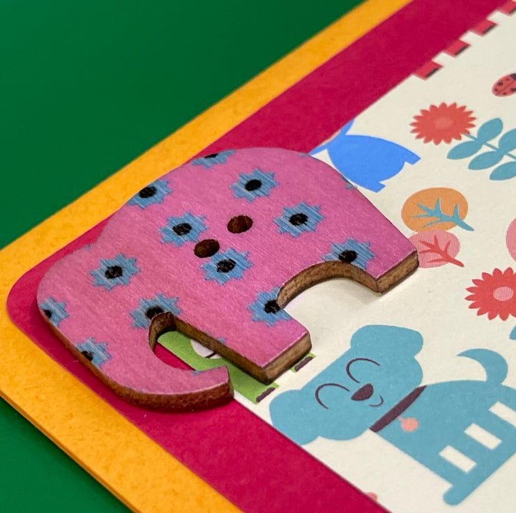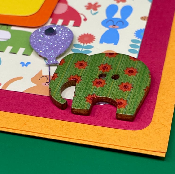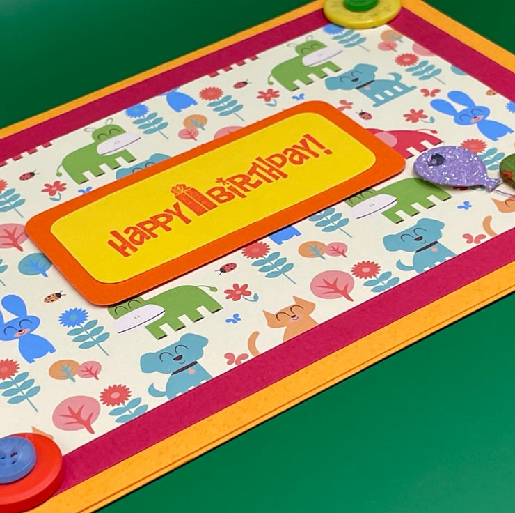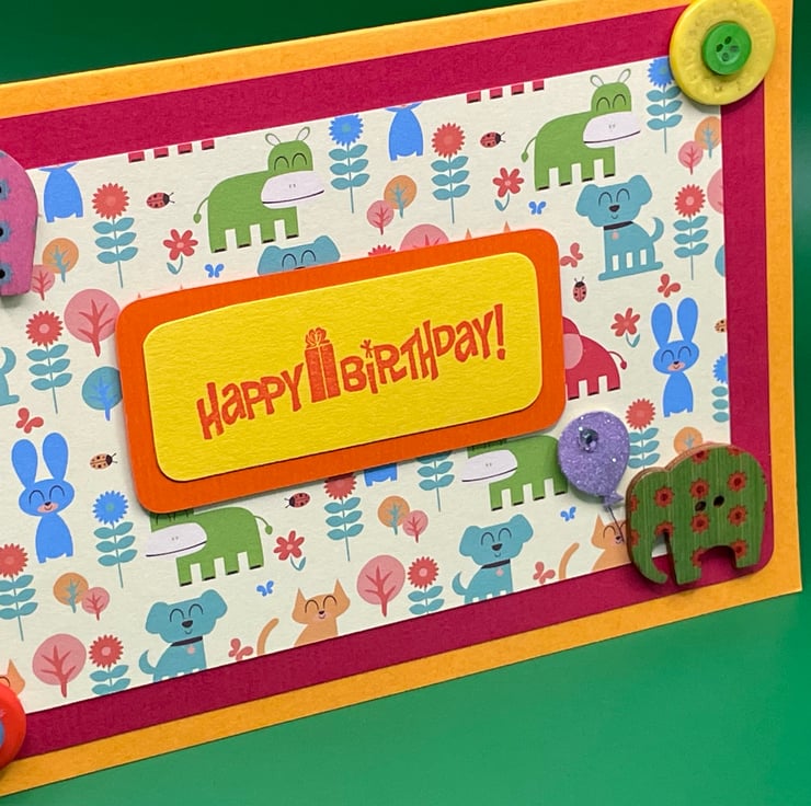 This colourful card has a bright orange base, red border and then a bright collection of animals all wanting to celebrate a Childs Birthday. The words "Happy Birthday!" are stamped on yellow card in the centre. Two wooden elephants and bright buttons adorn each corner of the card, a happy fun card for a kids Birthday celebration. Blank inside. Envelope decorated with rainbow striped washi tape and hearts. Size 18.5cm by 13cm.