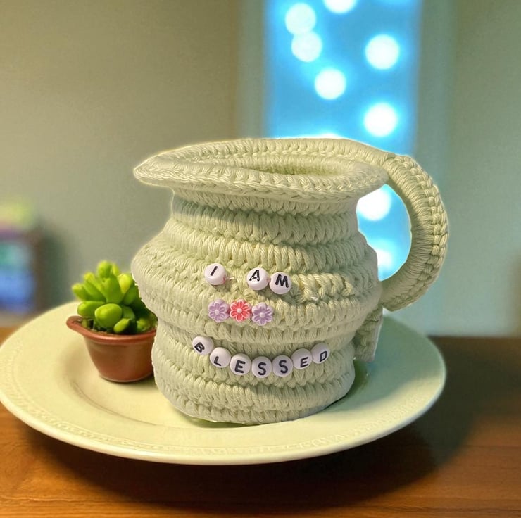 The basket features a simple, elegant design in a shape of a pitcher, with an affirmation made of beads that reads “I Am Blessed.” Every stitch is infused with mindfulness, serving as a daily reminder to appreciate the good in your life and to stay grounded in gratitude.