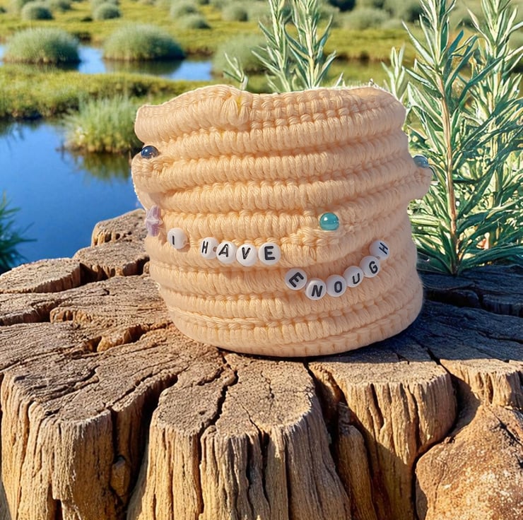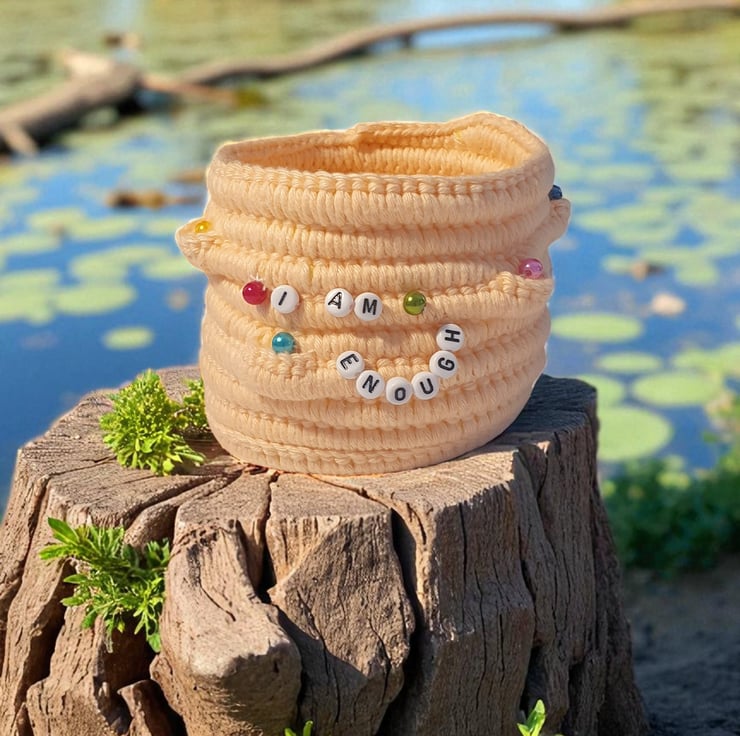 Add a touch of positivity to your space with this beautiful handmade, crochet basket. Carefully crafted with soft, durable yarn and detailed with hand-beaded affirmation words — “I Am Enough, I Have Enough” — this basket is more than just storage, it’s a daily reminder of self-worth and gratitude.