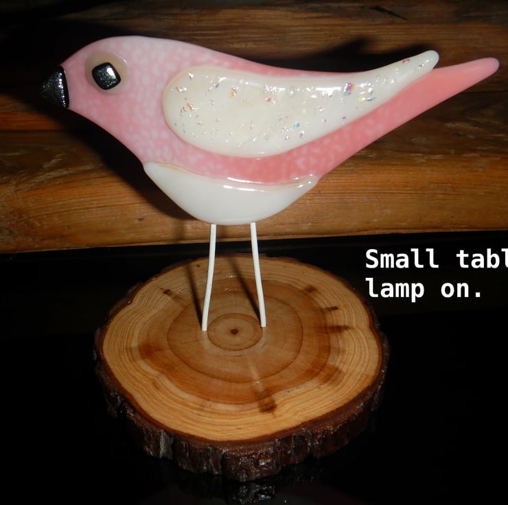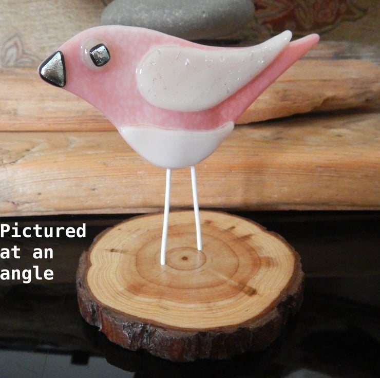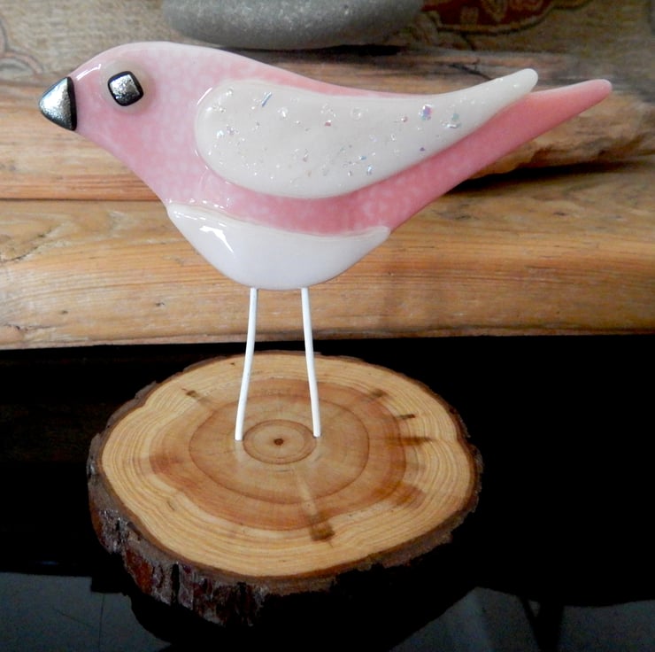 The little bird's legs are made from copper wire that has been fused into the bullseye glass in the kiln.