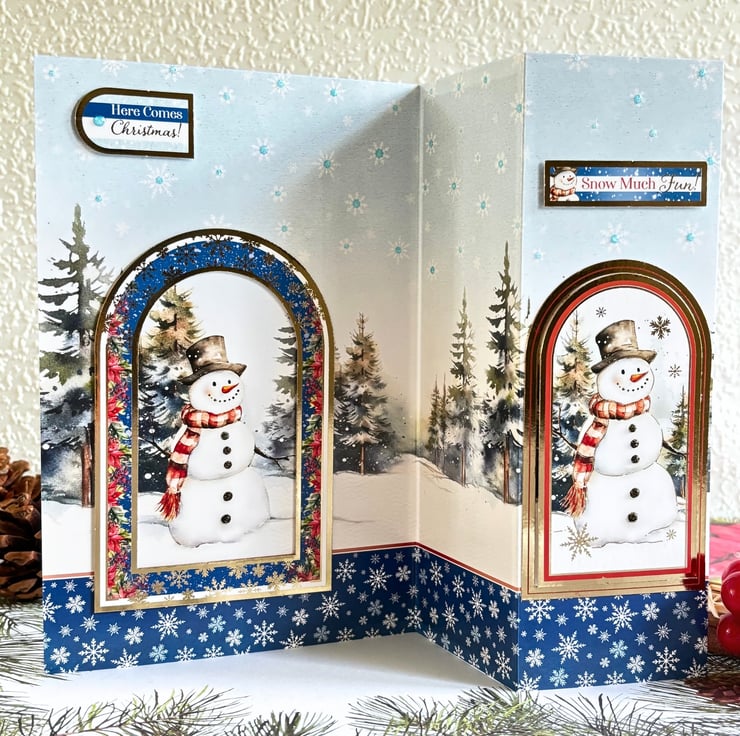 It consists of a luxury cardstock in blue tones, printed with the festive landscape and a decorative border at the bottom. The snowman on the left side of the card is surrounded by a matching decorative frame, while a smaller topper with the same snowman decorates the right panel. They are accompanied by the sentiments "Here Comes Christmas" & "Snow Much Fun". It is embellished with light blue glitter accents on the centre of the snowflakes and gold/black on the snowman buttons. It is finished with a matching insert at the back, with the sentiment "Christmas Wishes" cut-out from a blue glitter cardstock, in a decorative font.