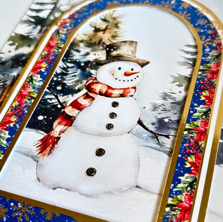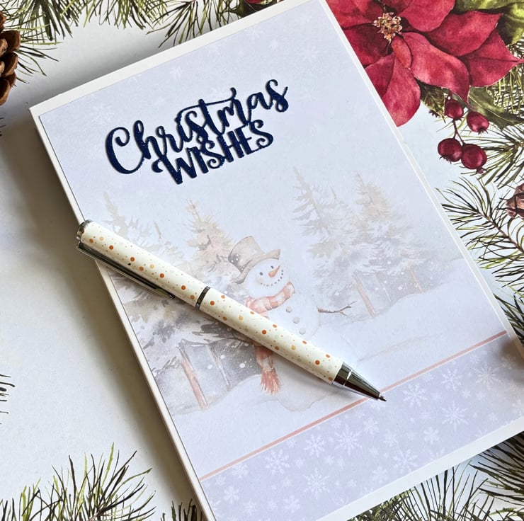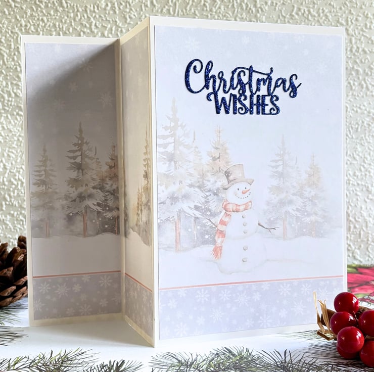 Handmade foldback Christmas card, displaying a smiling snowman in a wintry, snowy scene with Christmas trees in the background. Perfect for sending your wishes during the festive season!
