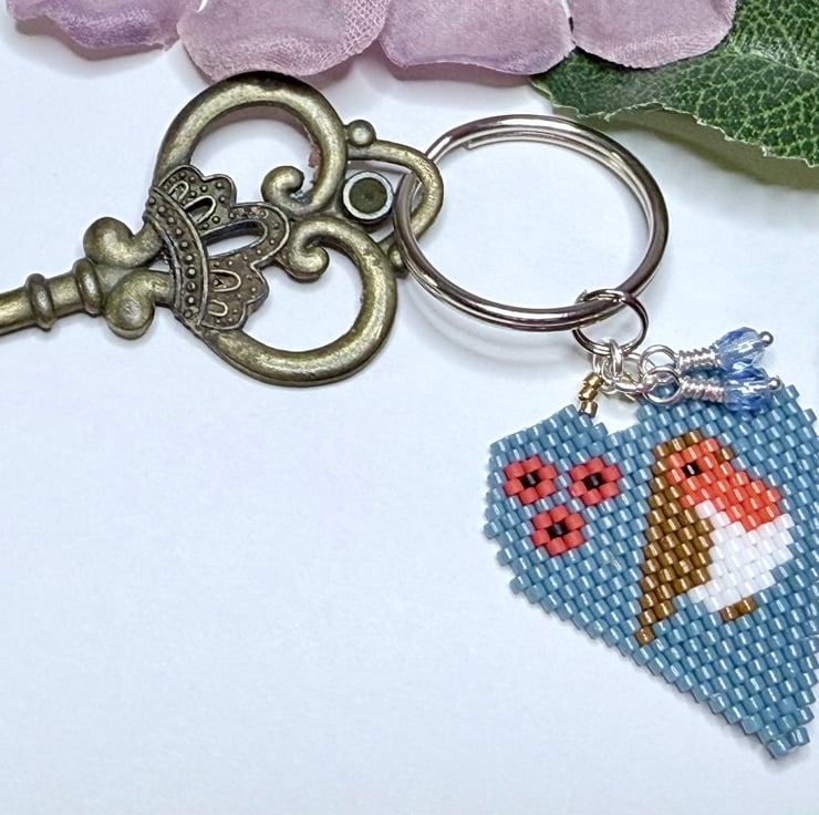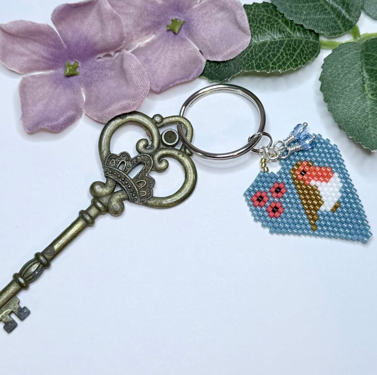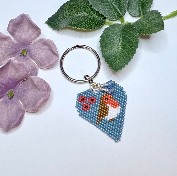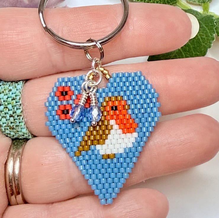 The bead-woven robin is heart-shaped, measuring 3cm by 3cm.