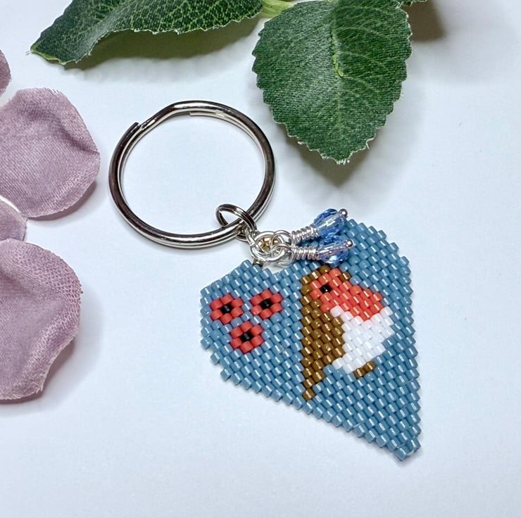 This charming remembrance keyring is handmade with tiny Japanese Miyuki delica seed beads that are hand-woven together to create the image of a little robin with a bright red breast. The robin is accompanied by three small red poppy flowers. The background features a cornflower blue colour and the keyring is finished with 2 handmade charms, made with pale blue fire polished Czech glass beads.