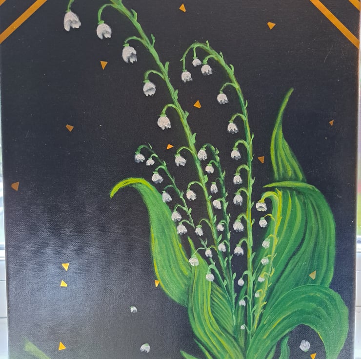 This painting was inspired by the quiet beauty of lily of the valley – a flower that symbolizes purity, renewal, and gentle strength. I wanted to capture its delicate form and calming presence against a bold, dark background, creating a sense of contrast and timeless elegance.