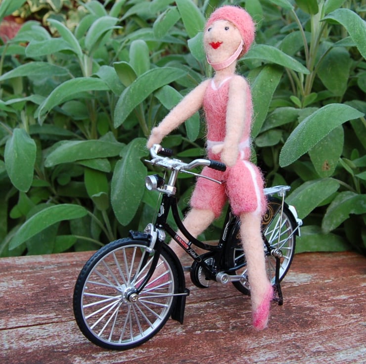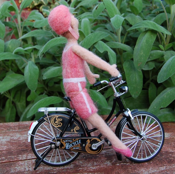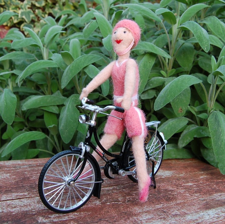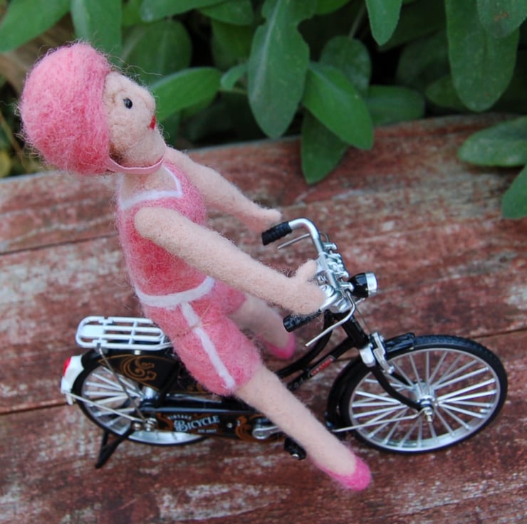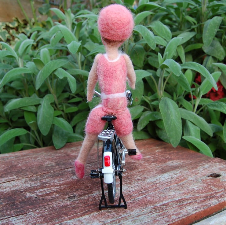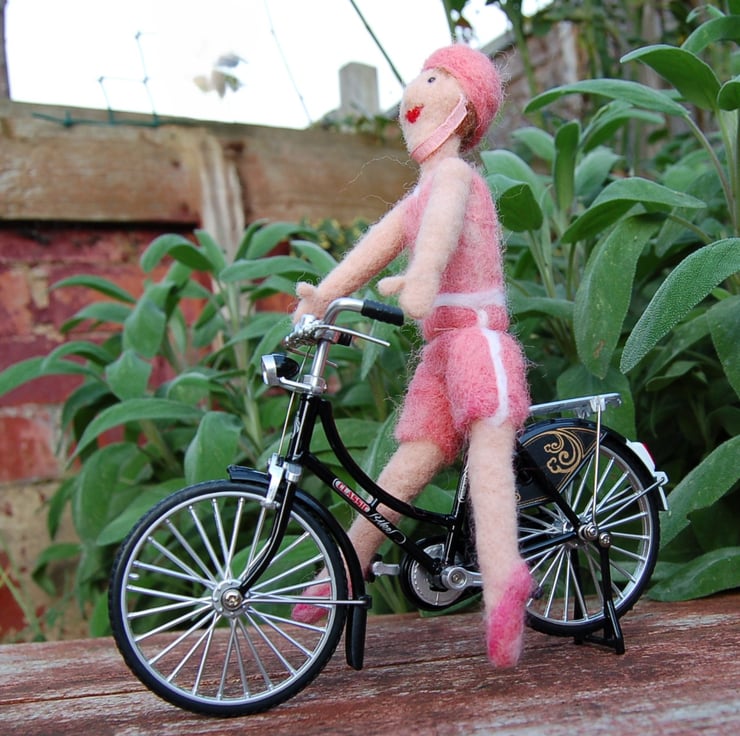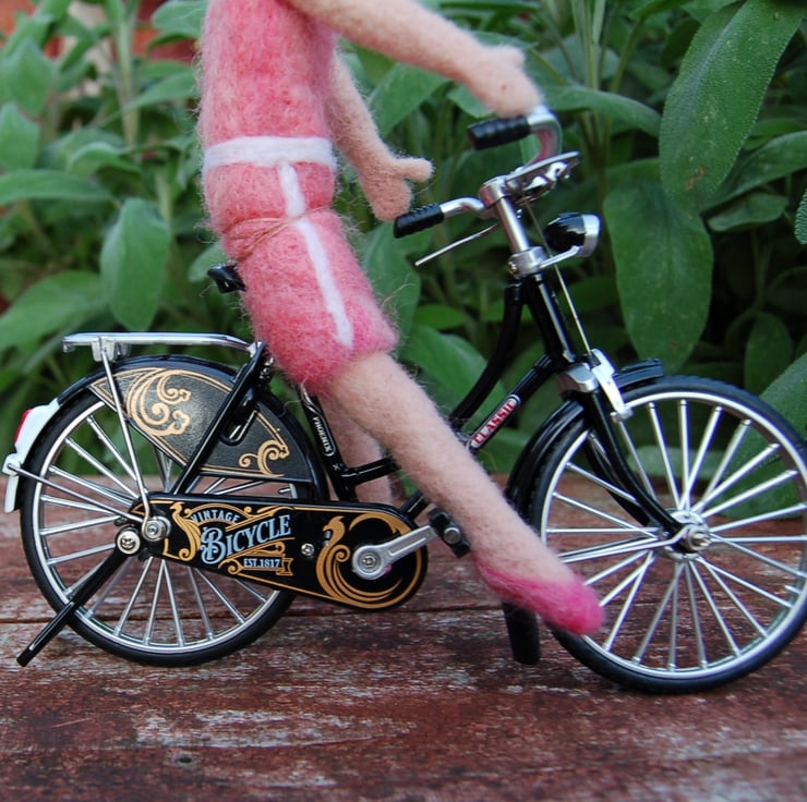 I have made the figure by needlefelting wool fibres into shape. Her arms and legs are jointed where they attach to her body. She is attached to the cycle with a dab of glue on the saddle and cotton thread wrapped around and under the saddle making her quite stable. Although she should be handled with care.