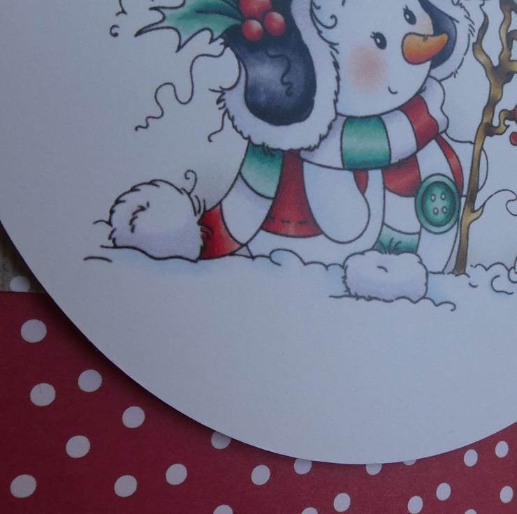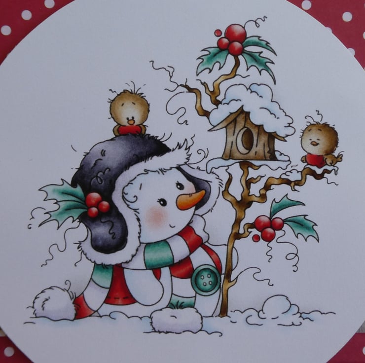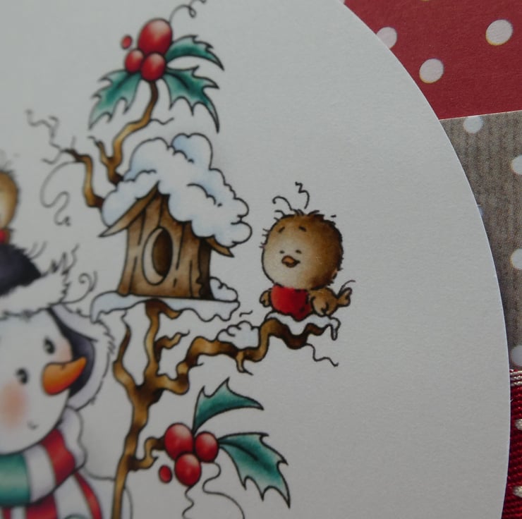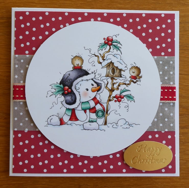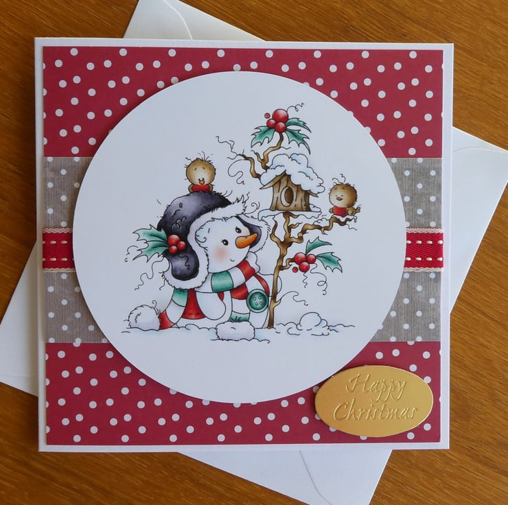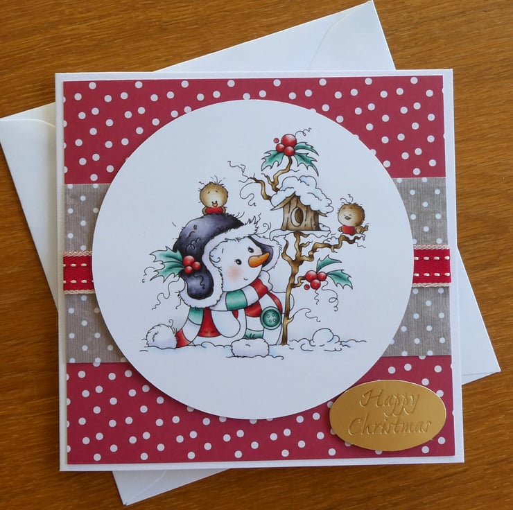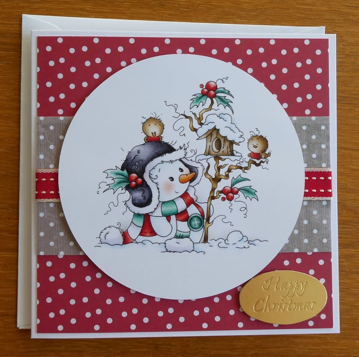 This sweet Christmas card, with the message Happy Christmas, has a central printed topper showing a cute snowman wearing a red, white and green scarf and a black hat. The snowman is standing next to a bird house, with one robin sitting on a branch and one on the snowman's hat.