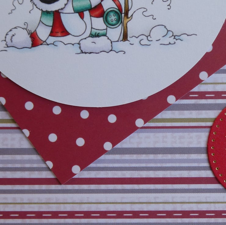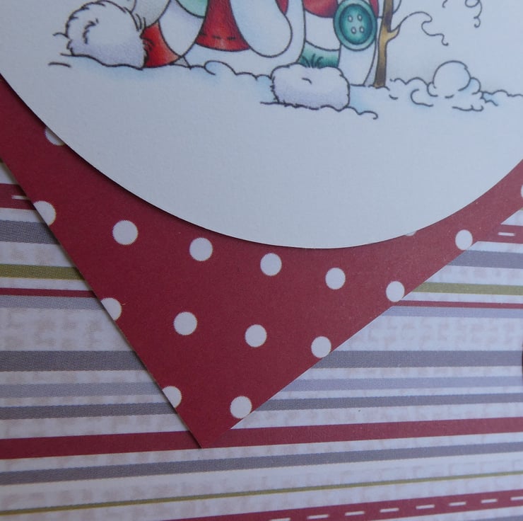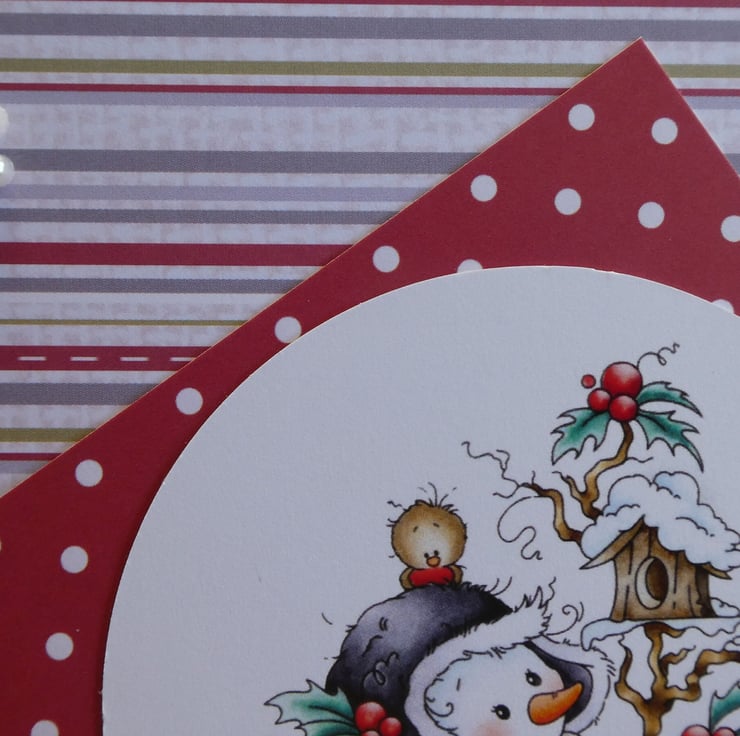An off white snowflake embellishment has been added in the top left corner and a circular red message with the words Happy Christmas in gold in the bottom right corner to complete the design.