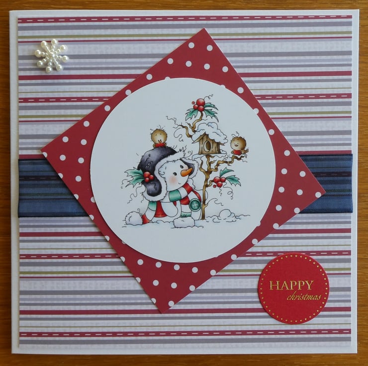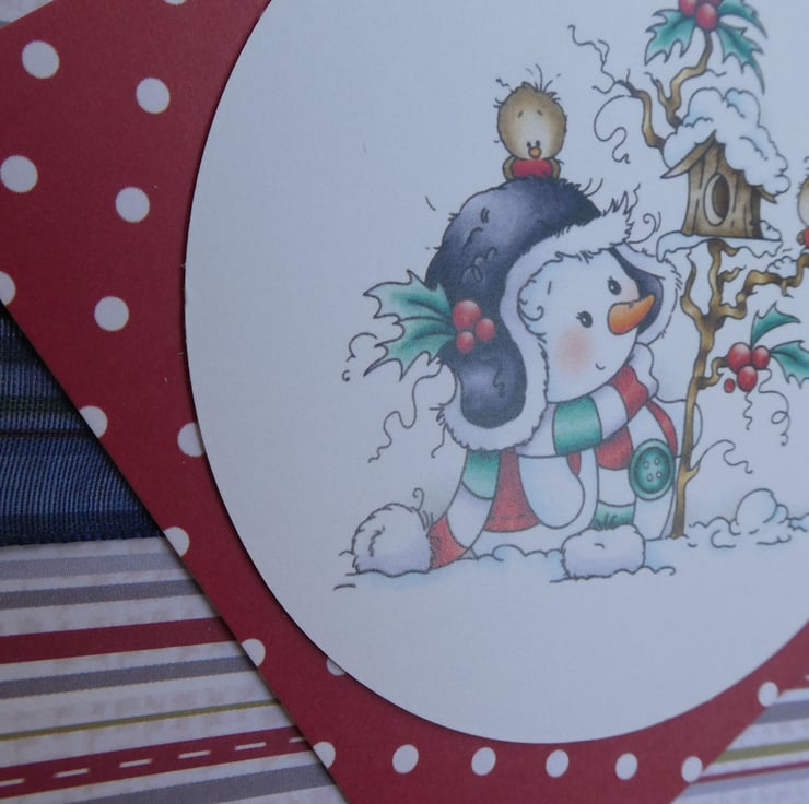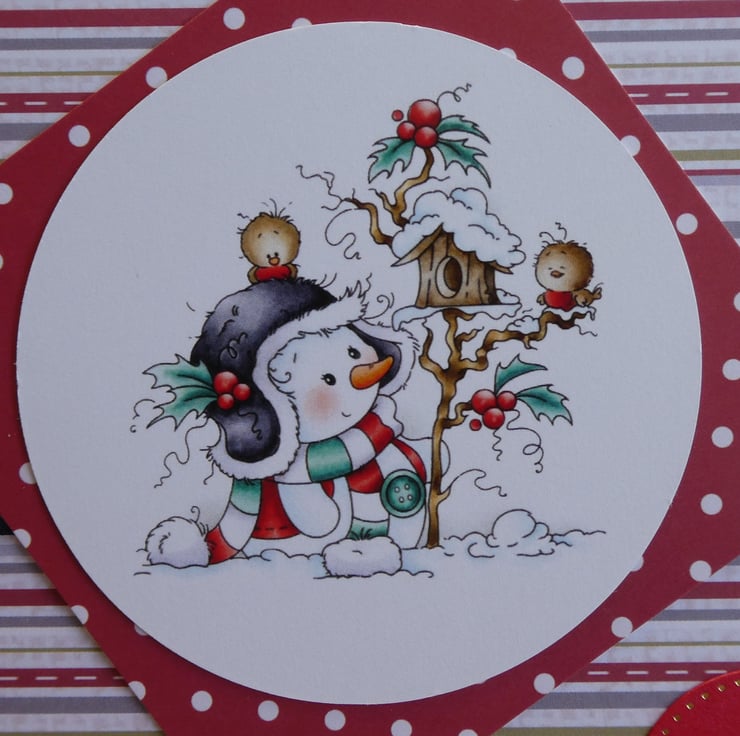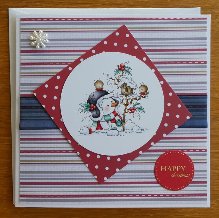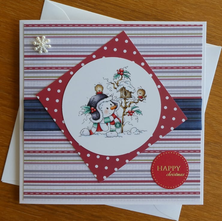 This sweet Christmas card, with the messages Happy Christmas and With Love, has a central printed topper showing a cute snowman wearing a red, white and green scarf and a black hat. The snowman is standing next to a bird house, with one robin sitting on a branch and one on the snowman's hat.