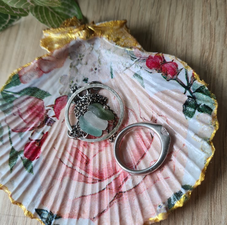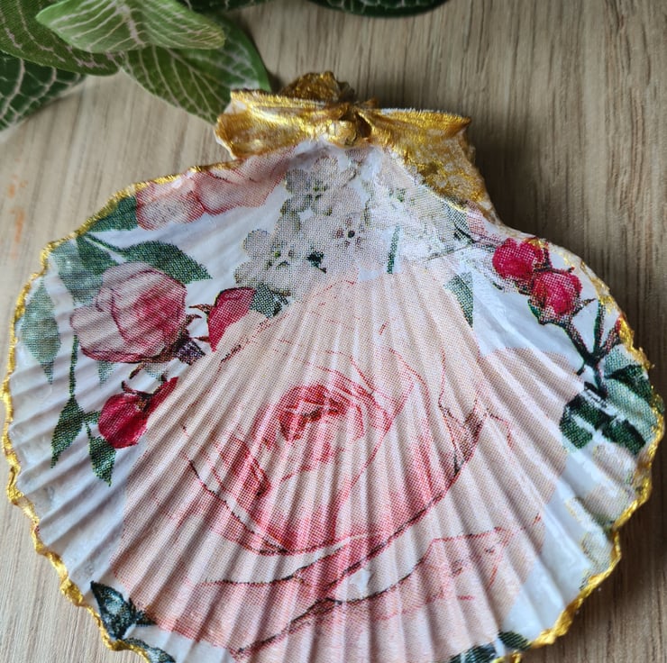 This beautiful small scallop shell has been cleaned and I painted it before decoupaging with a pretty pale pink rose design paper napkin.