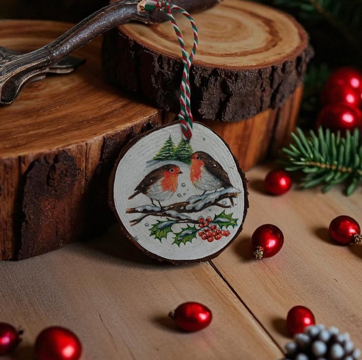 Add a charming festive touch to your Christmas tree with a wooden slice ornament. Hand-painted, decoupaged, sealed, and completed with a festive holiday hanging loop, it's the perfect decoration.