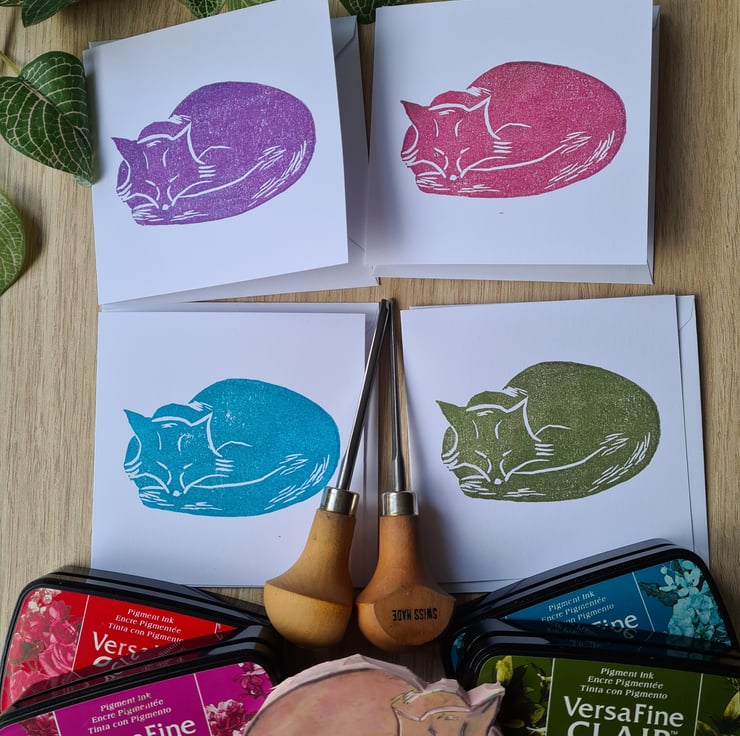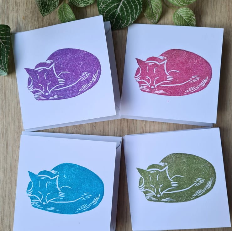 Pack of four notecards with envelopes - all handprinted with a cute sleeping fox rubber stamp which I have designed and carved, and using quality ink pads. Also available with gift wrapping in a separate listing - see 'notecards and thank you cards' collection.