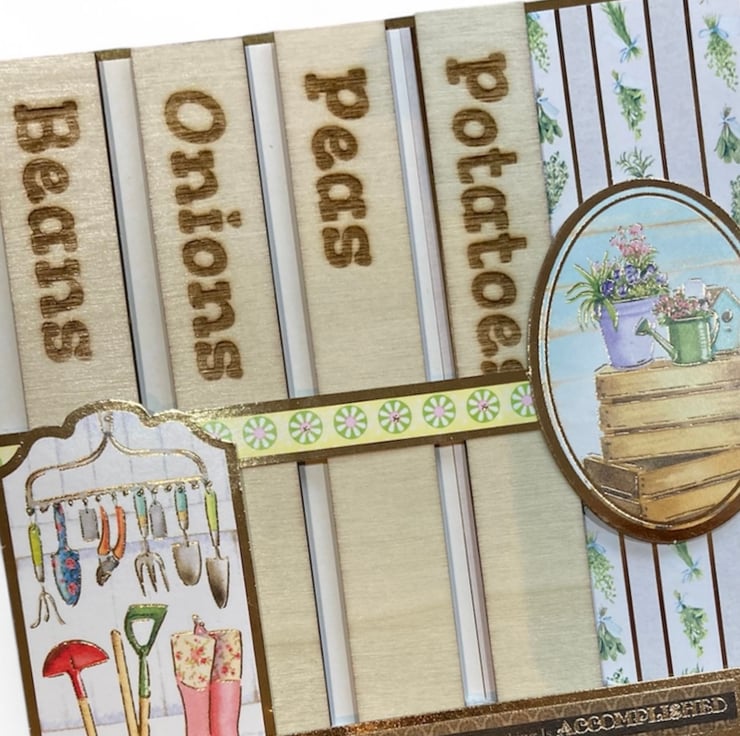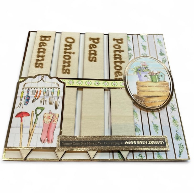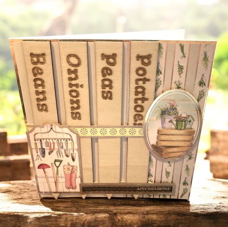 Delight the gardener in your life with this charming 6 x 6 handmade card, complete with four natural wooden plant markers — perfect for labelling vegetables in their garden.