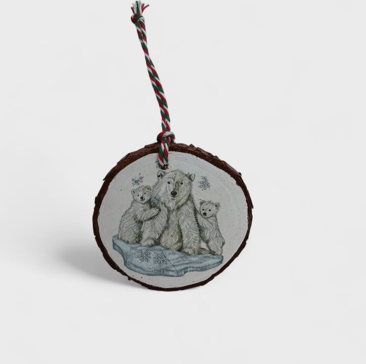 Add a charming festive touch to your Christmas tree with a wooden slice ornament. Hand-painted, decoupaged, sealed, and completed with a festive holiday hanging loop, it's the perfect decoration.