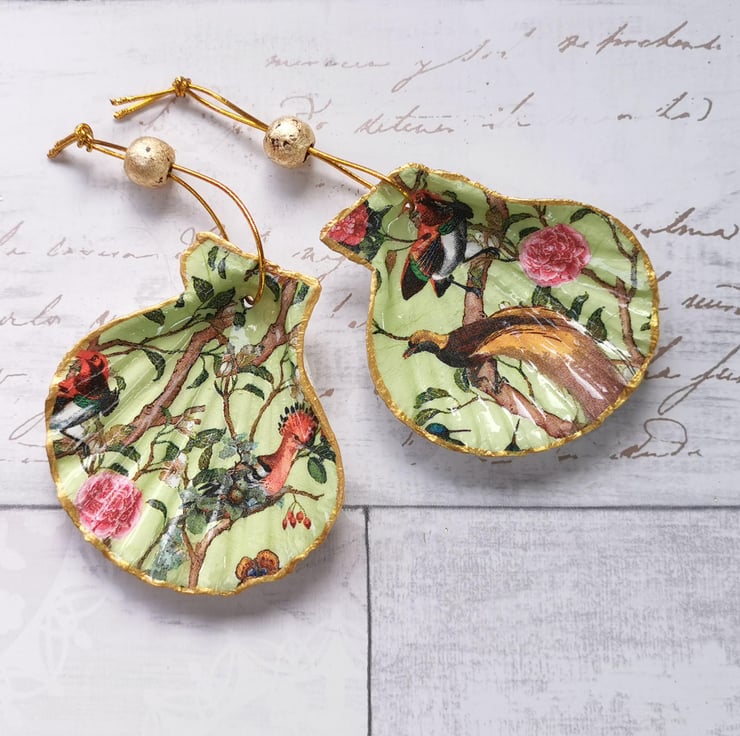 Two Hanging Shell Ornaments, Green & Gold Christmas Tree Baubles
