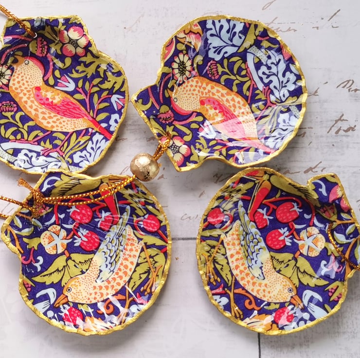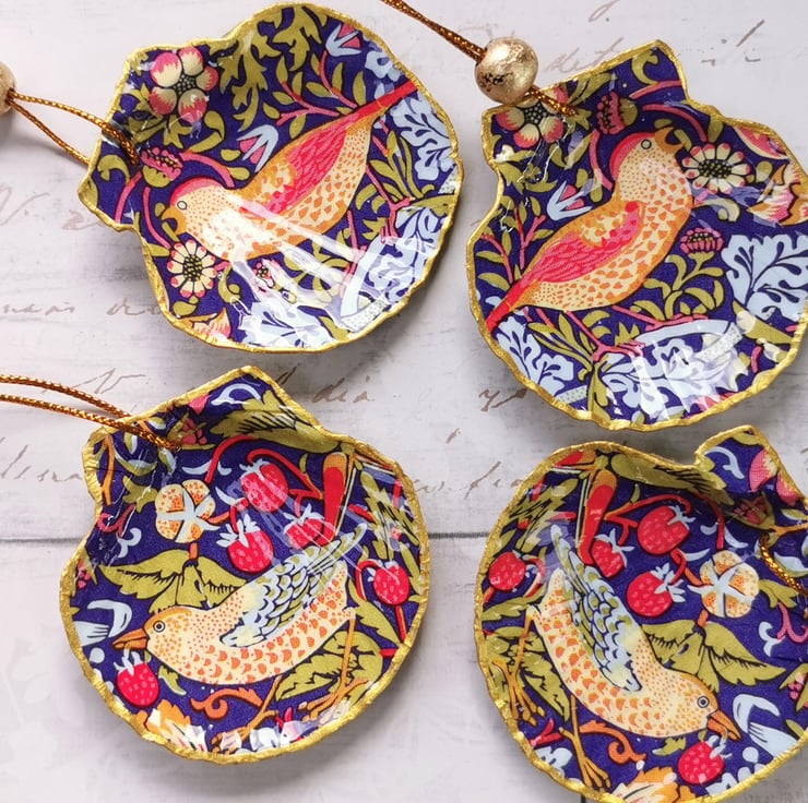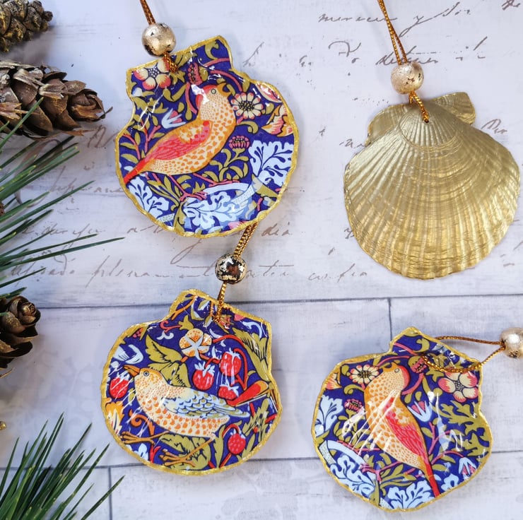 Set of Four Hanging Shell Ornaments: William Morris Christmas Tree Baubles
