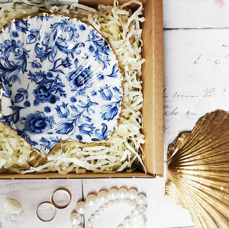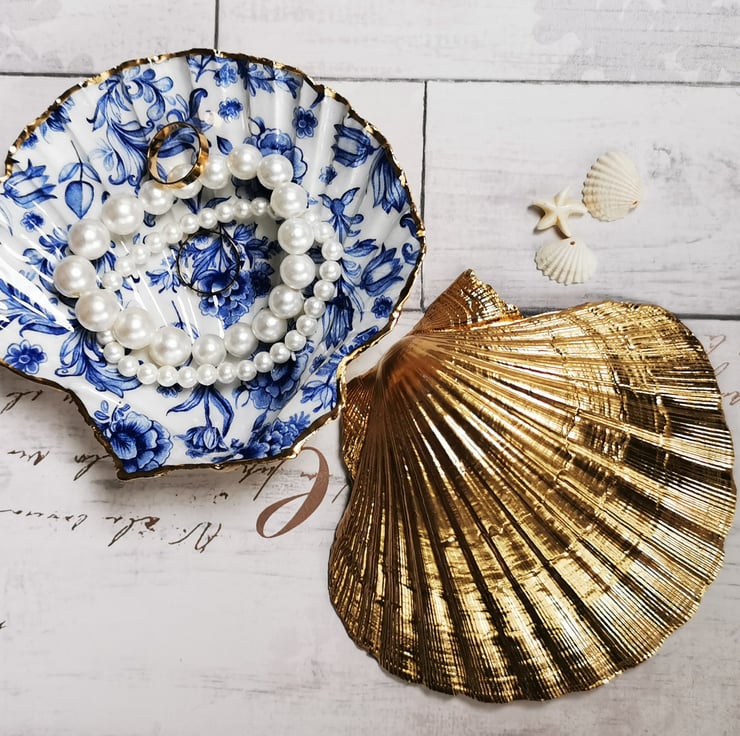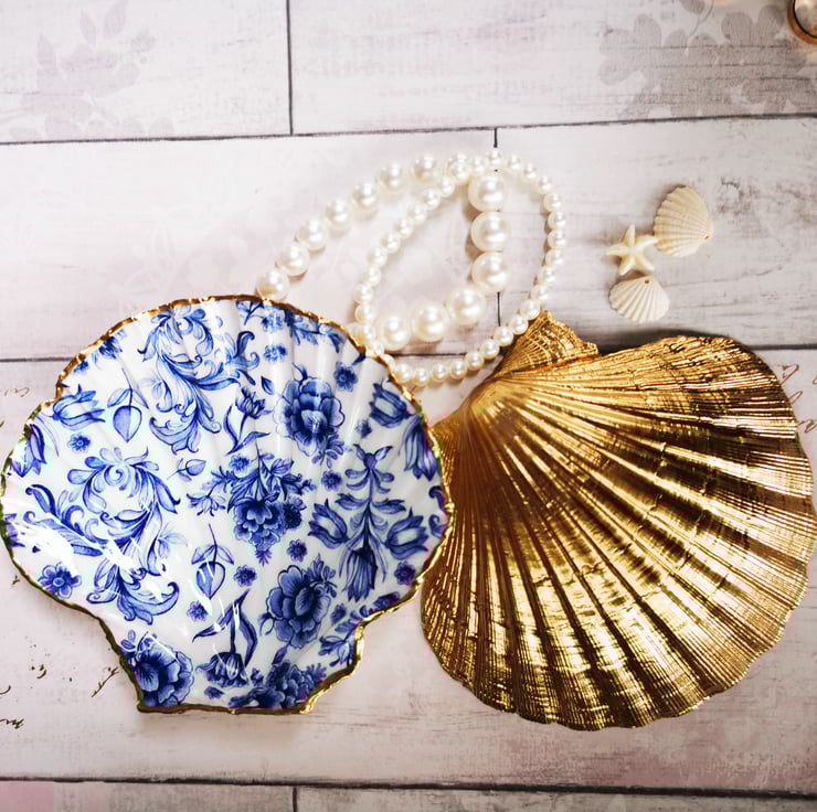 A decorative ring or jewellery dish in a blue and white floral design. These trinket dishes are handmade using the decoupage technique on to natural scallop shells. The shells are sealed and glazed with resin on the inside, giving them durability and a beautiful glossy porcelain look. The edges and backs of the shells are gilded with gold.