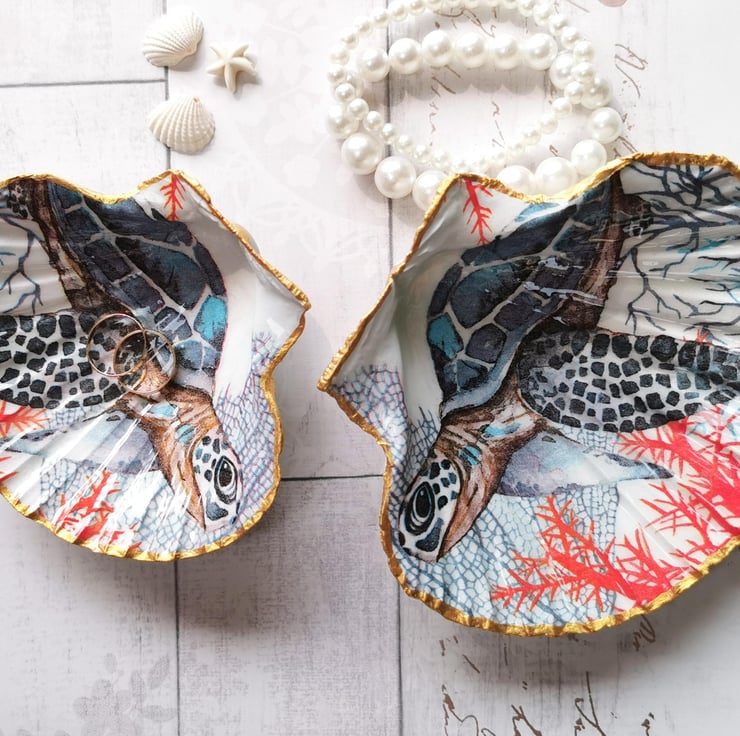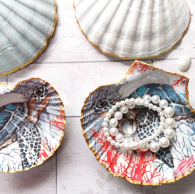 Scallop Shell Jewellery Dish, Ocean Turtle Design