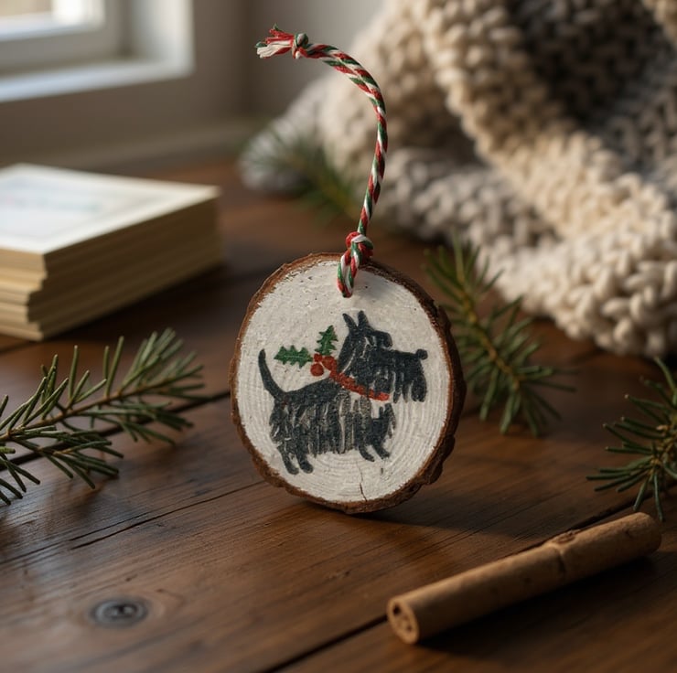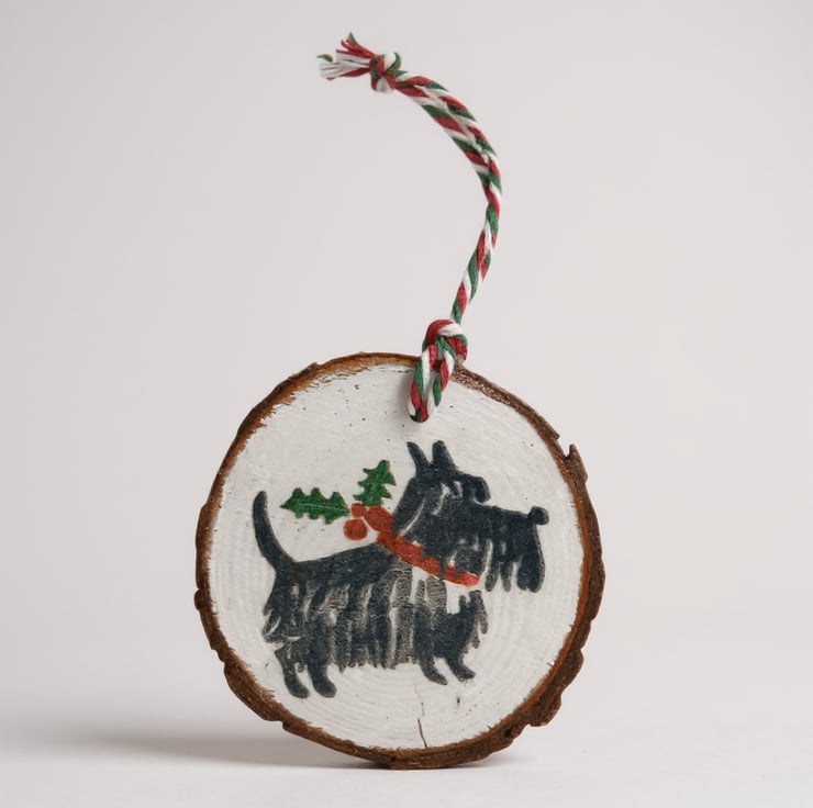 Scottie Dog with Holly & Berries Round Wooden Christmas Decoration Tree Ornament