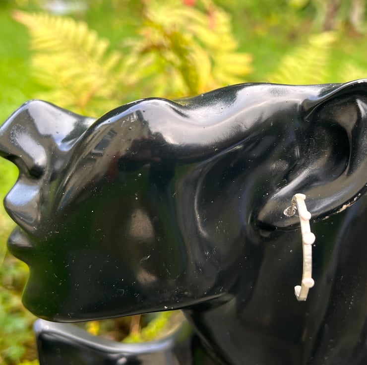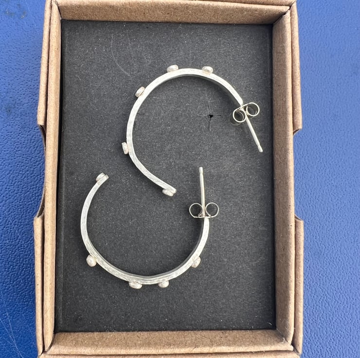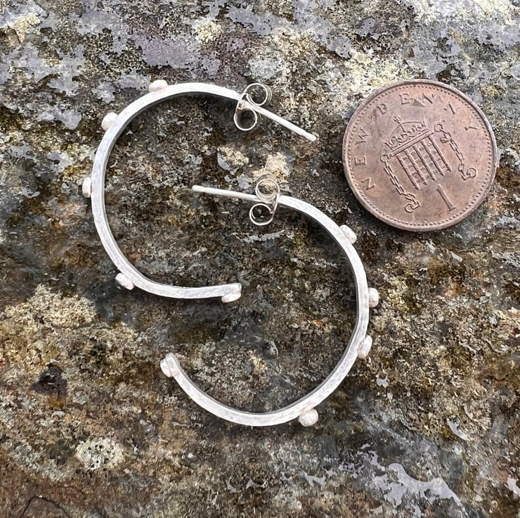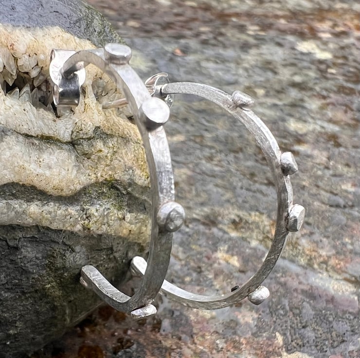 Textured hoop earrings with silver pebbles placed along the facing edge. They are fastened onto the ear with sterling silver ear posts and scroll backs.