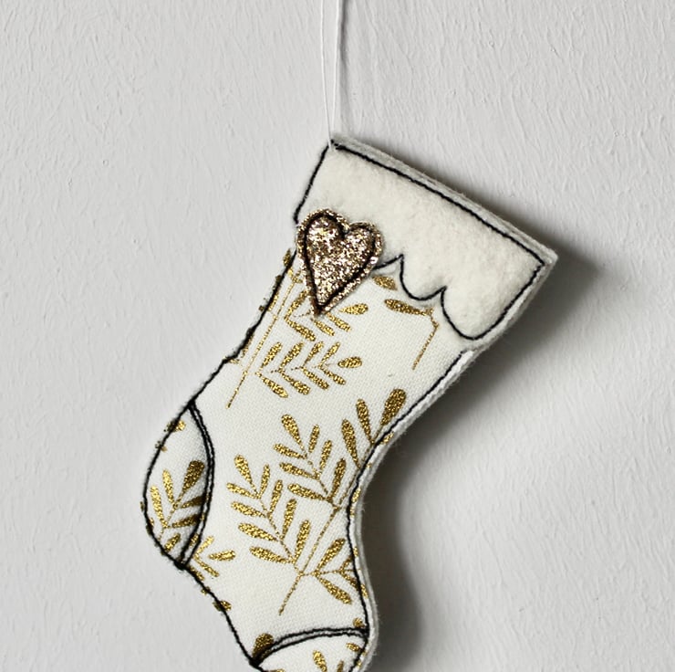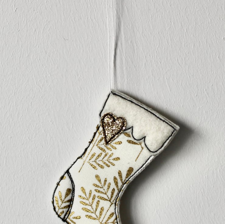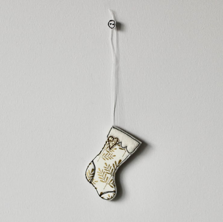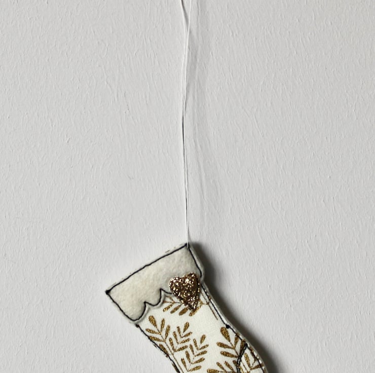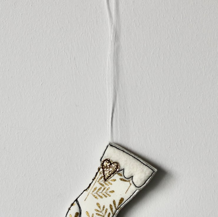 A delightful hanging decoration which is created using 100% wool felt, cotton cloth, glitter cloth, free hand machine embroidery and cut out by hand, using a very sharp pair of scissors.
