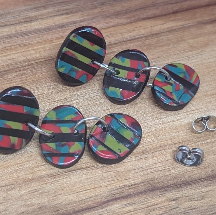These are stunning polymer clay earrings, starting with a stud and then two connected elements. The sections are small oval pebble shapes, with black horizontal stripes interjected with colourful sections, of green, red and teal. Each pebble is also coloured over the edges, adding to their dynamic.