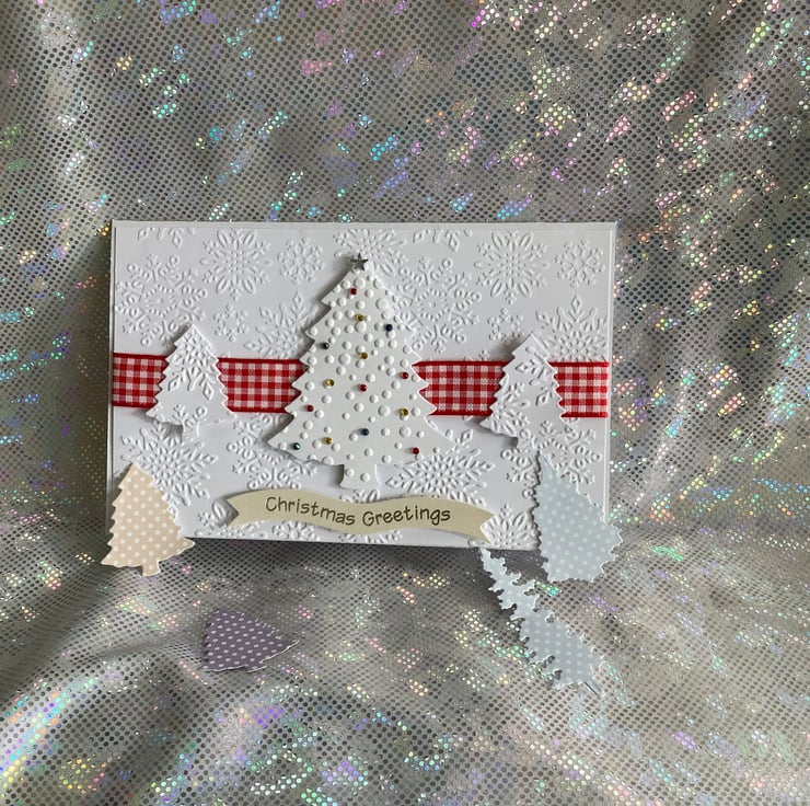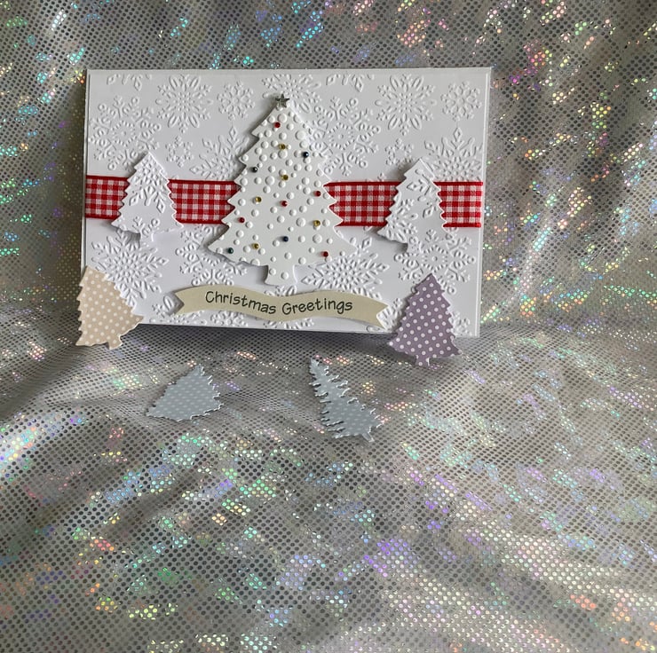 Cheerful style tent card with background patterned with snowflakes with a Christmass tree design centrally placed on the front. This card is nice to look at due to its simple design.