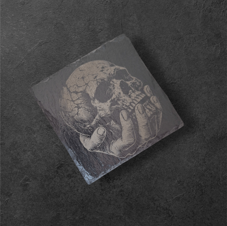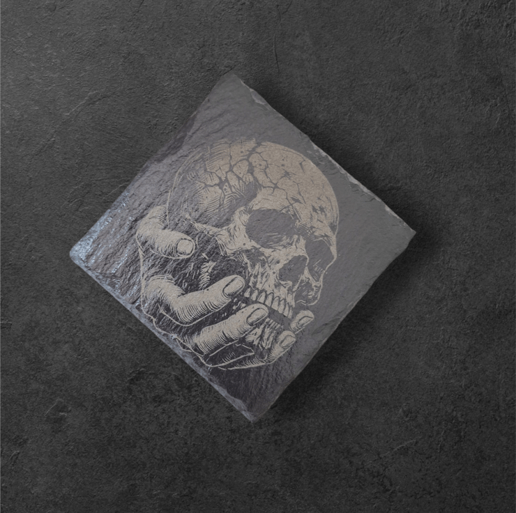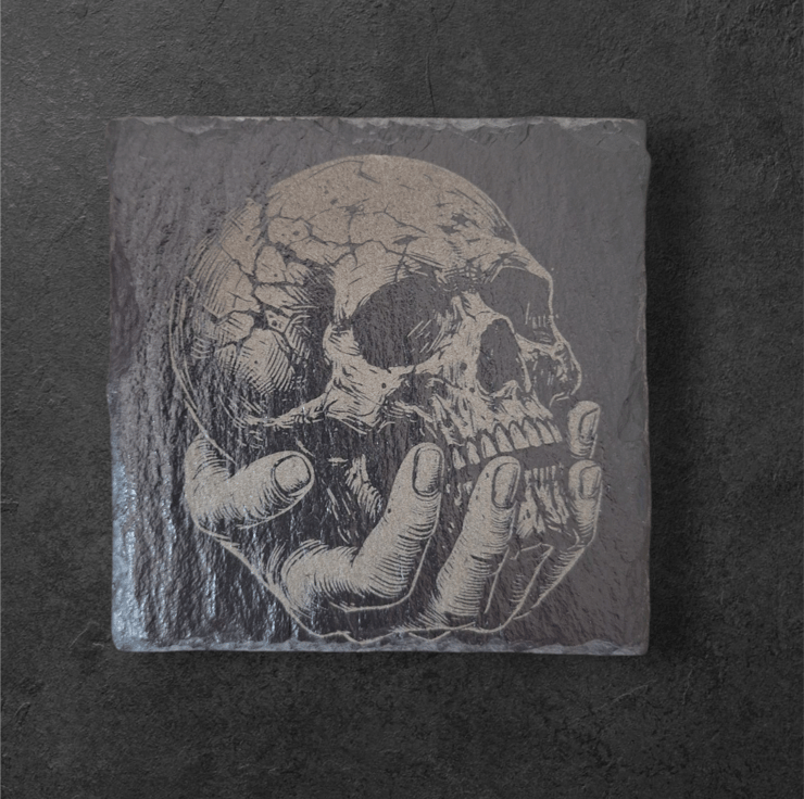 Engraved Skull in Hand Slate Coaster – Gothic & Occult Decor