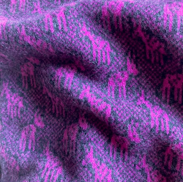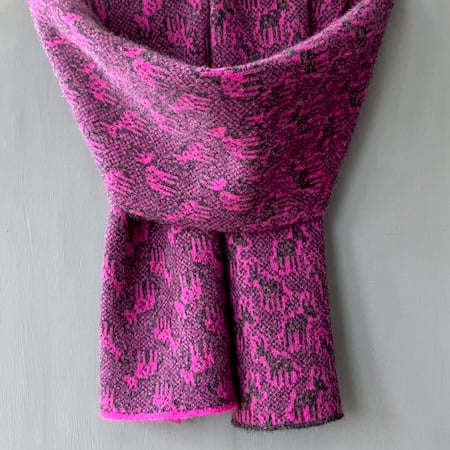 This is a two-colour hand-crafted merino lambswool scarf with a special donkey design, in magenta and charcoal.