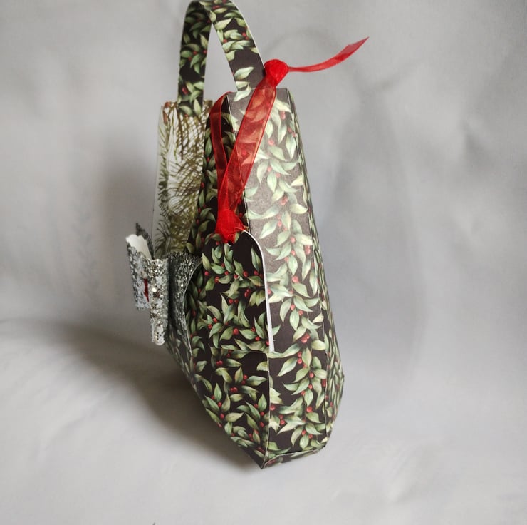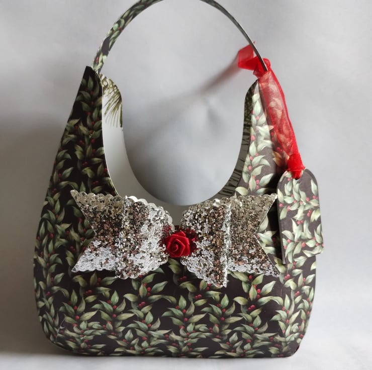 The holly leaves bag is decorated with a beautiful silver tiny sequin paper bow with a red satin ribbon rosebud and has a matching tag tied with beautiful red organza ribbon and is filled with Christmas red tissue paper.