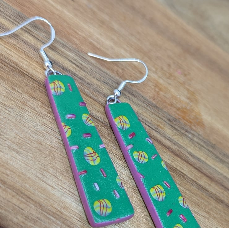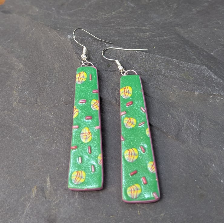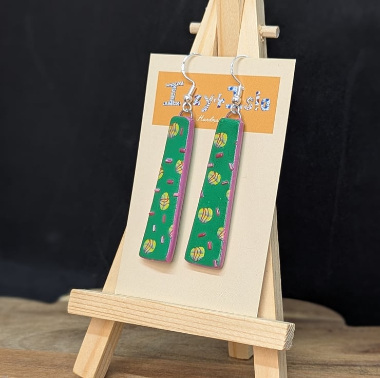 Handcrafted from polymer clay, the bright green earrings are adorned with a fun repeating pattern of circles with pink lines, and small dashes of pink. The sides are edged in a contrast pale pink and the reverse remains green with a dotted pattern. (why should the back be boring).