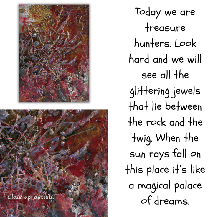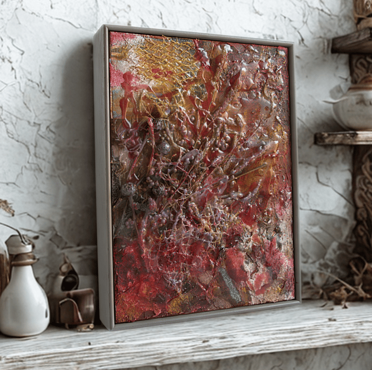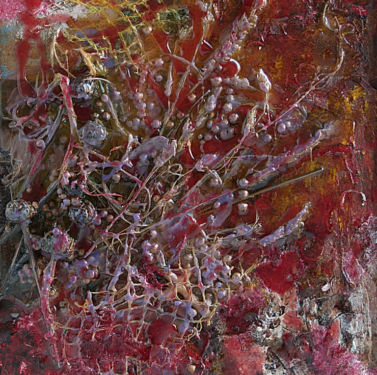 This is an mixed media artwork based on exploring creativity through nature. I have foraged, recycled and collected a range of materials in a celebration of the landscape. I have embedded a range of dried grasses and seeds and objects into thick layers of paint and encased the whole lot with streaks of coloured resin. Finally, I have set the artwork in a contemporary wooden frame.