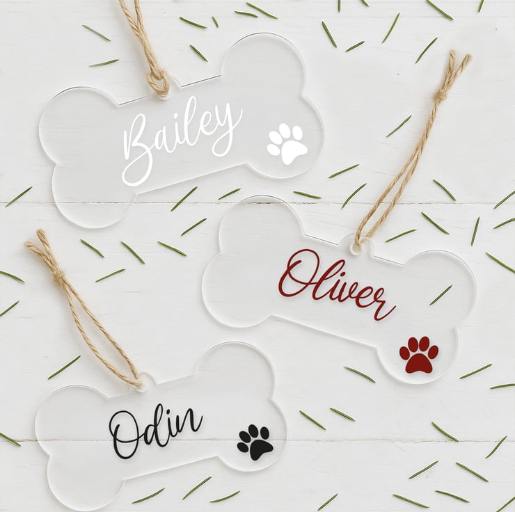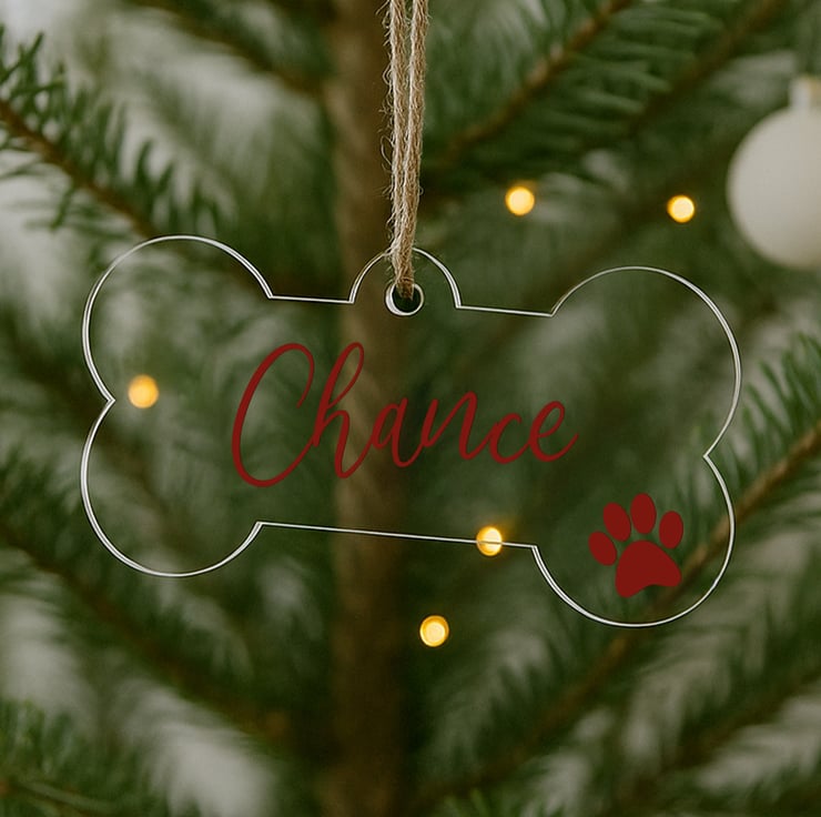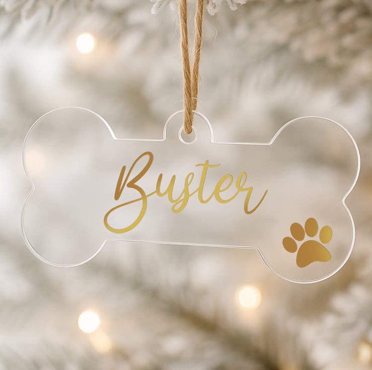 Celebrate your furry friend in style this festive season with this Personalised Dog Bone Christmas Bauble. Crafted from premium clear 3mm acrylic, this modern ornament features your pet’s name in high-quality vinyl — available in a range of stunning colours to match your Christmas décor. Finished with a cute paw print and natural hemp string for easy hanging, this bone-shaped decoration makes a beautiful addition to your tree or a thoughtful gift for any dog lover.