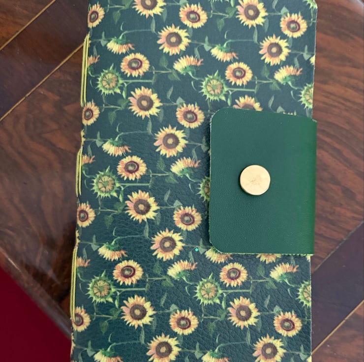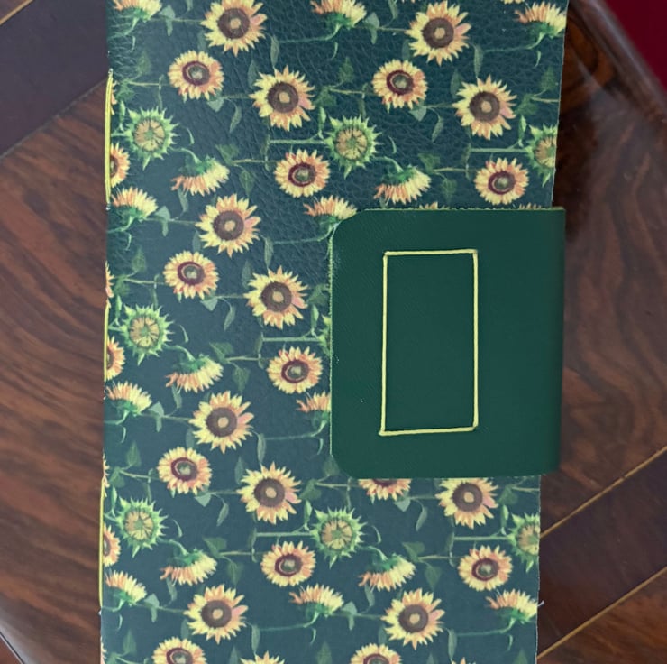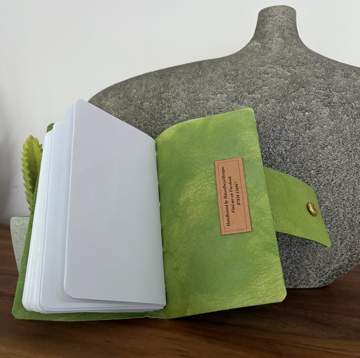 It is handbound using a decorative long stitch in coordinating thread. The cover is faux leather with a contrasting painted inside. The corners are rounded and the book is fastened with a contrasting flap and press fastener.