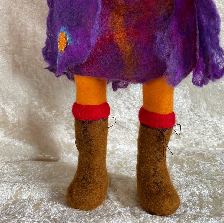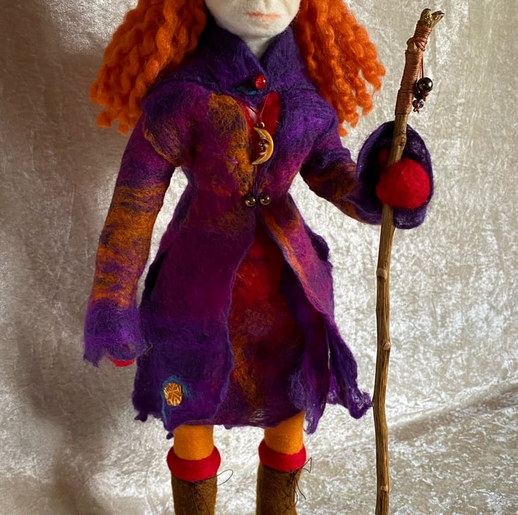 She is a needle-felted doll with a stainless steel wire armature and wet-felted and needle-felted clothes. The wool is mainly in purple, red and orange - vibrant and beautiful. She has multi-layered clothes, mittens and boots. Her hair is a chunky acrylic yard. The staff is Hawthorn from the wild hedge behind my rural abode and is waxed and decorated.