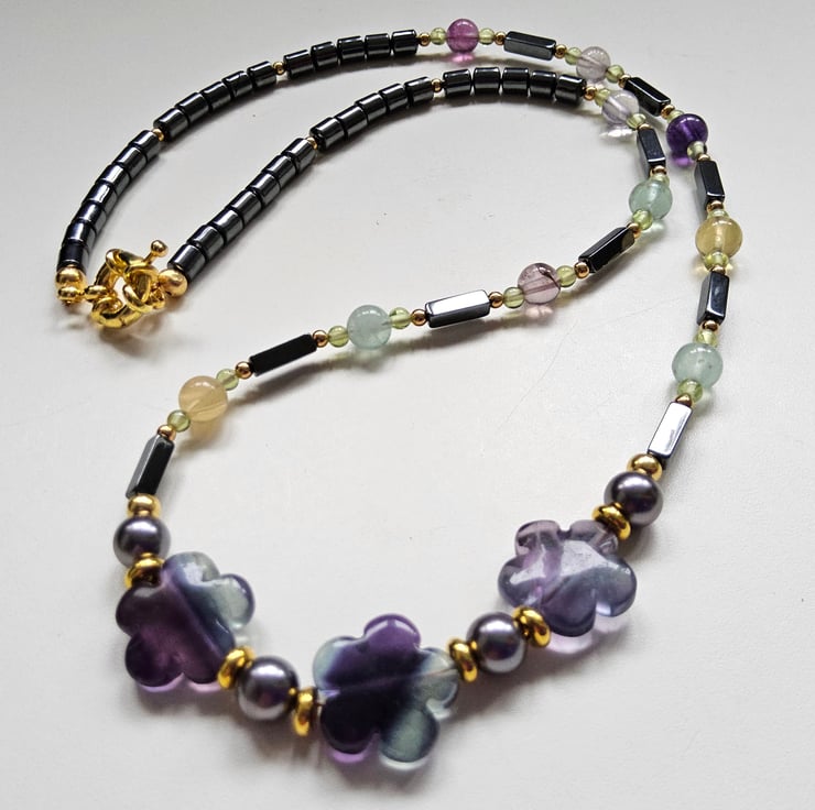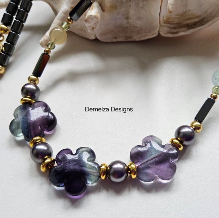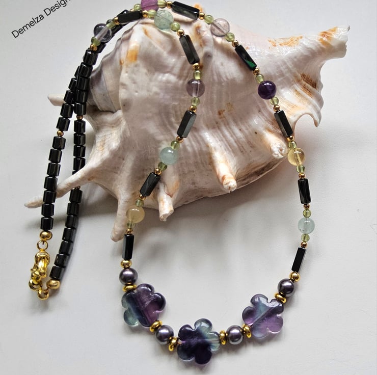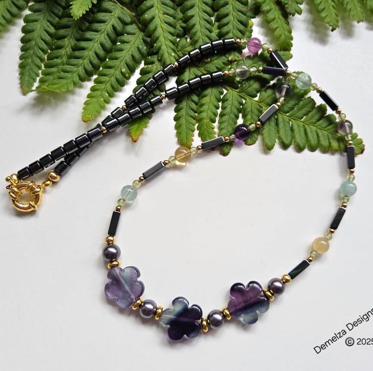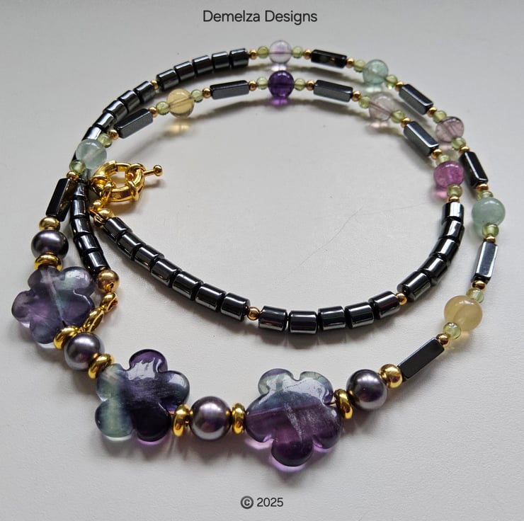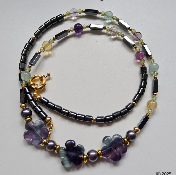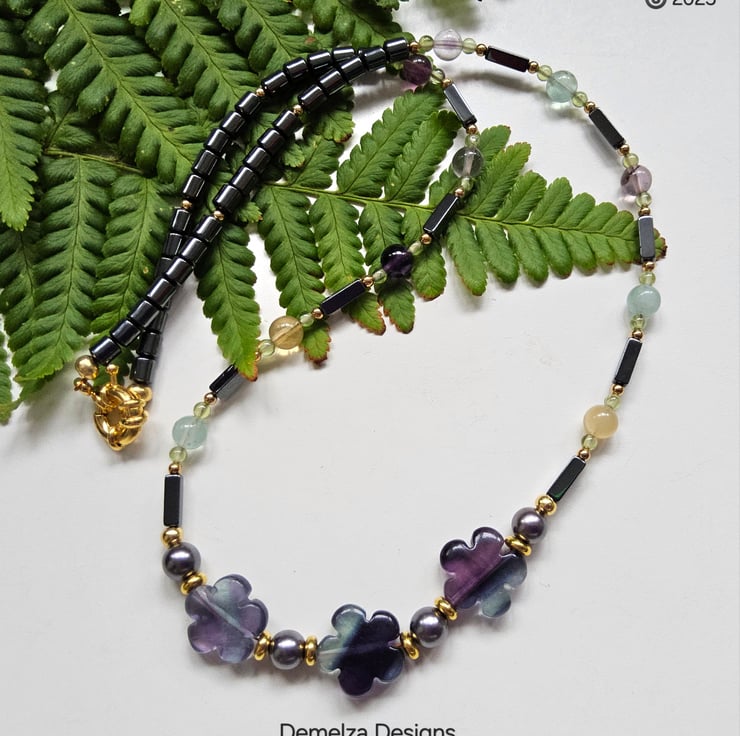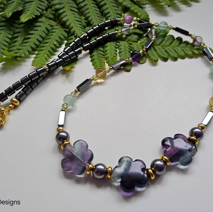 This stunning necklace has been lovingly designed and hand crafted in Cornwall using quality flourite and heamotite gemstones. It will make the perfect unique gift for ladies whom like to wear artisan gemstone jewellery on a daily basis.