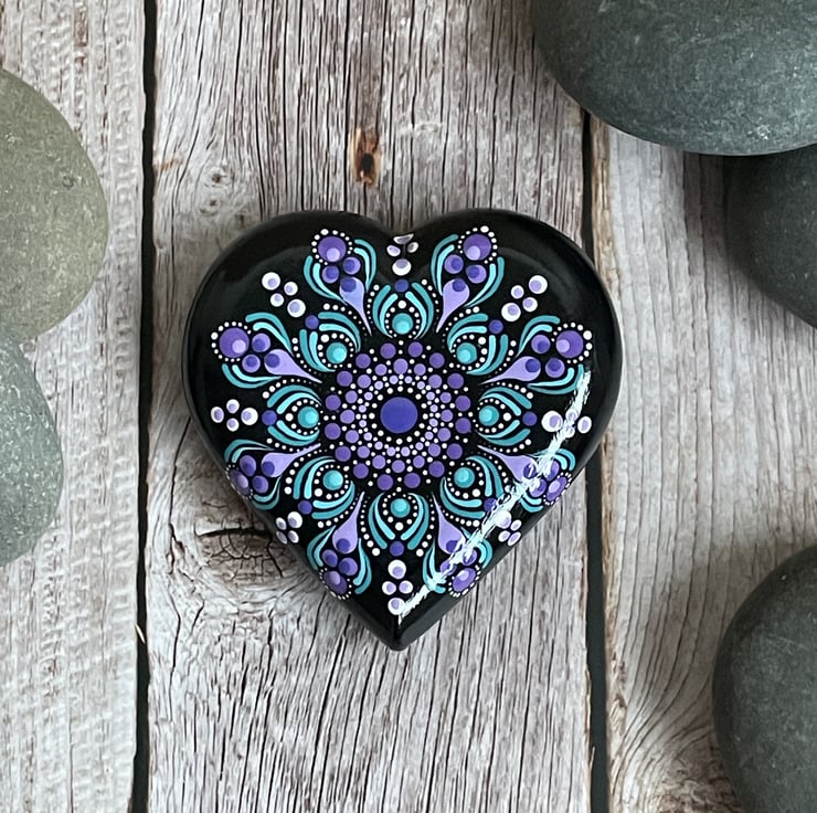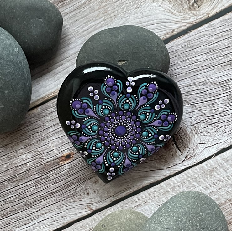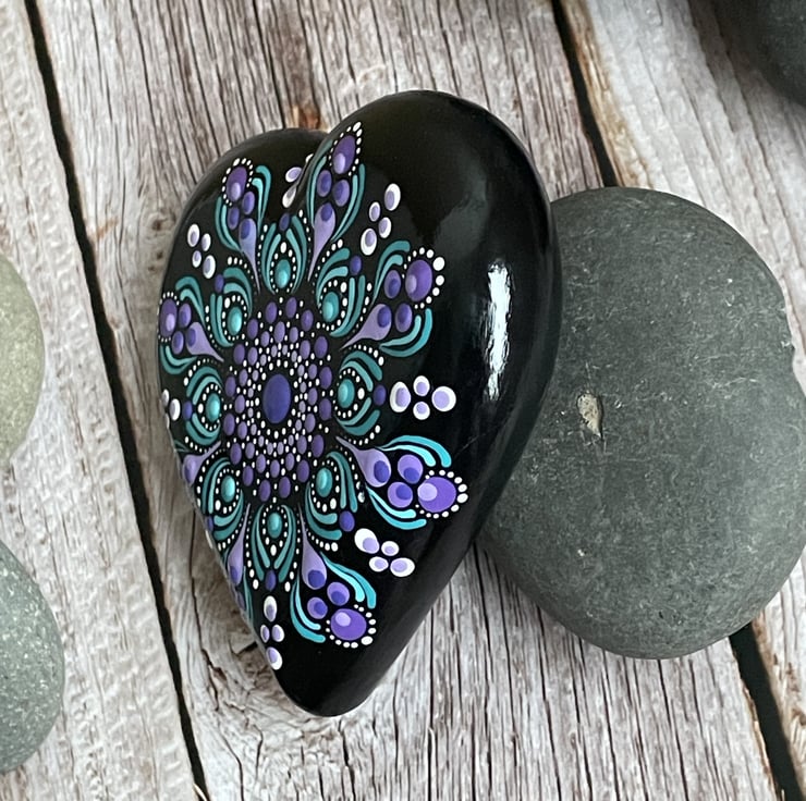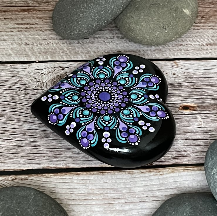 Purple & Green Heart Mandala Rock Art Stone Acrylic Painting Hand Painted Unique